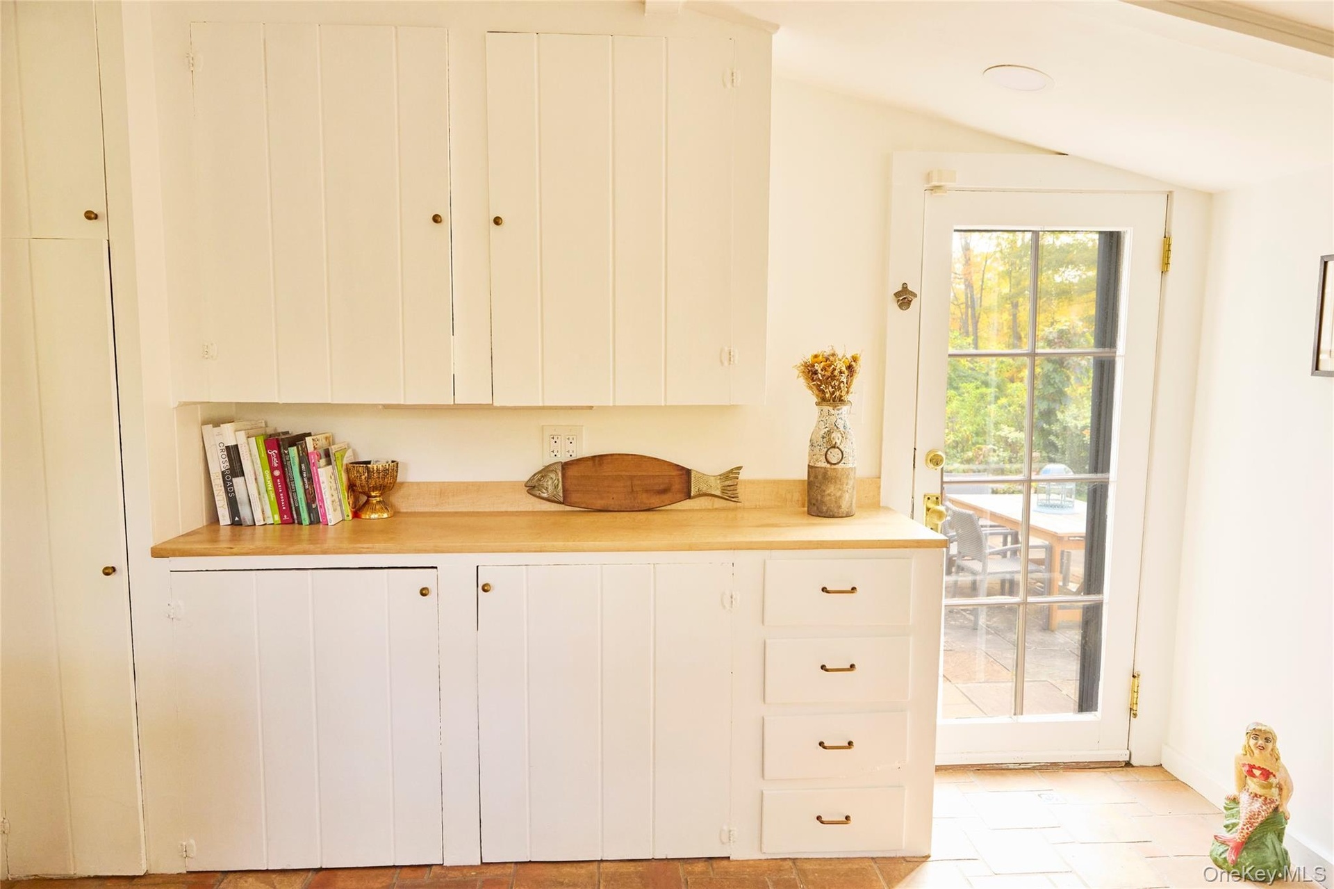 - View of restored antique cabinets, and door leading out to bluestone patio with outdoor dining table.