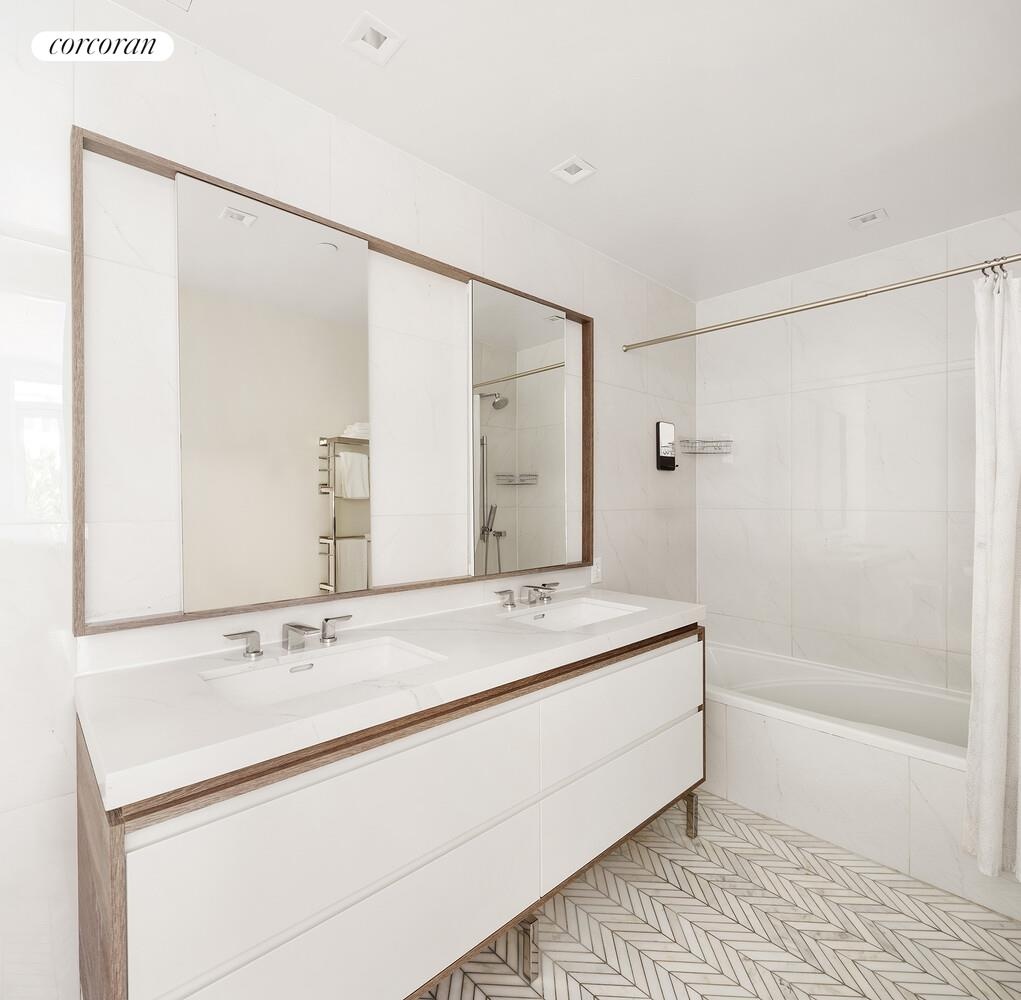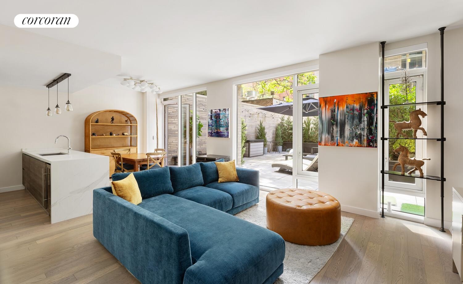 Inside, the unit is meticulously designed with light oak flooring that flows seamlessly throughout. The open-concept kitchen is a culinary delight, showcasing white lacquer cabinetry, sleek white quartz countertops, and state-of-the-art Bosch appliances, including an oven, refrigerator, and dishwasher. The residence is further enhanced by a Bosch washer and dryer, a sophisticated Silhouette wine refrigerator, and an InSinkerator food disposal, and electric shades installed throughout, ensuring every modern convenience is at your fingertips.