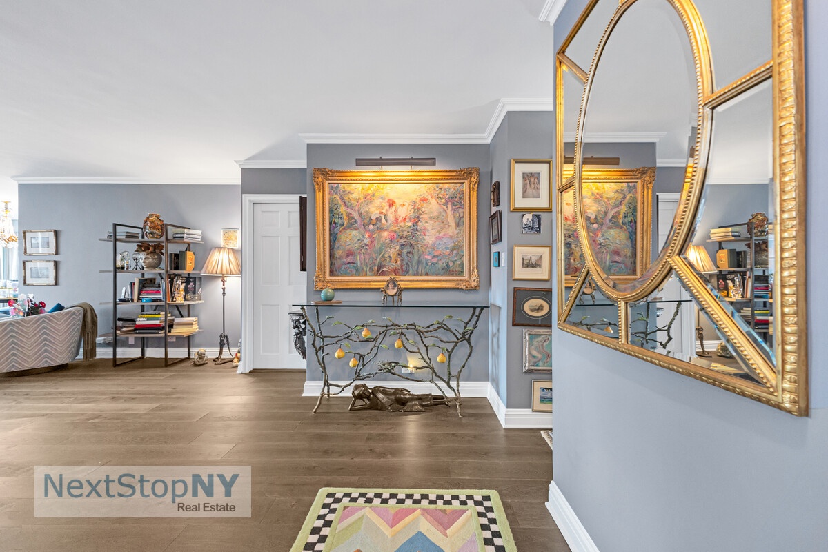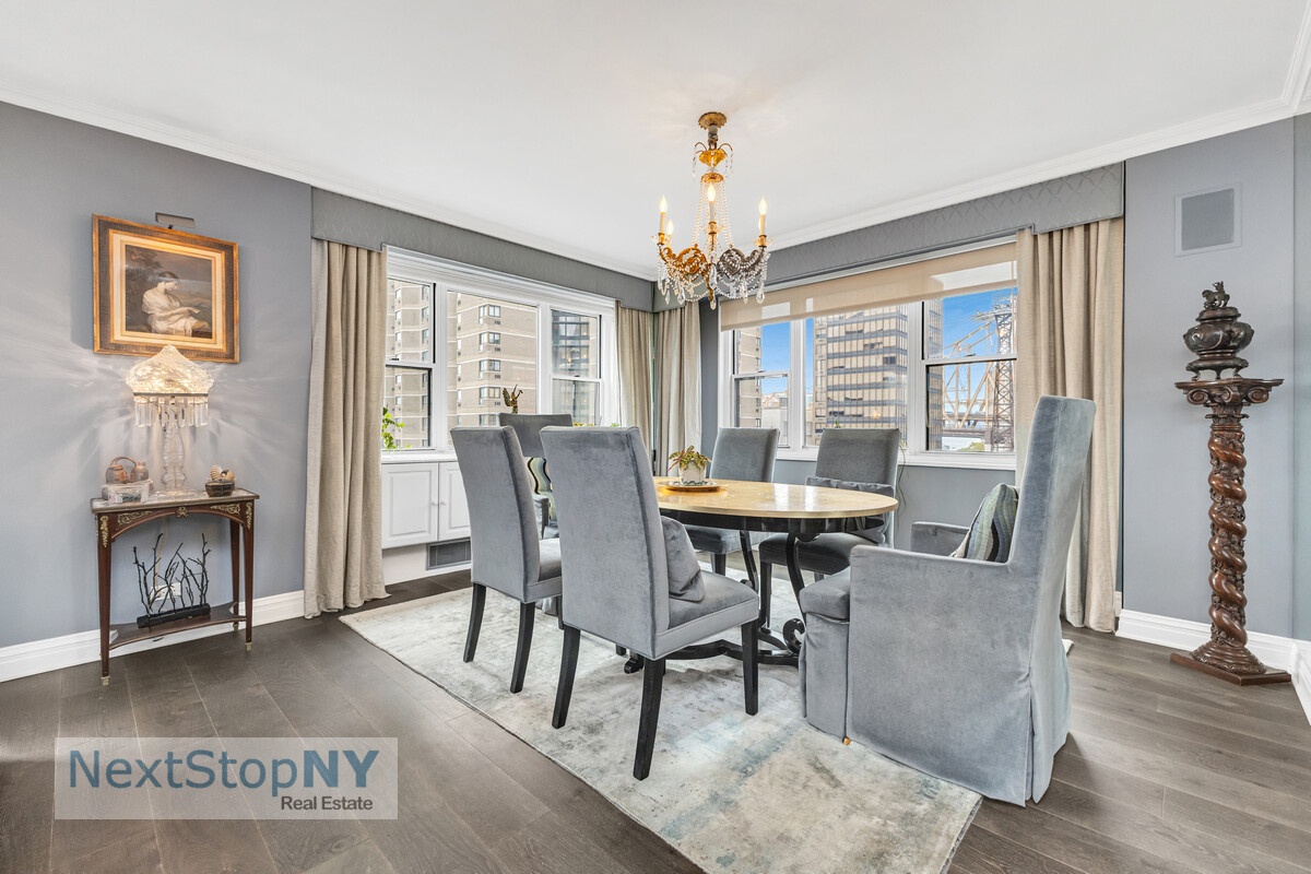 Upon entry, an oversized foyer opens to a sprawling 36-foot living room and a separate 15-foot dining room with dual exposures. Walls of windows frame sweeping East River views, while southern and eastern exposures flood the home with natural light throughout the day. The living room easily accommodates multiple seating areas or a den, and the dining room offers the option to convert into a fourth bedroom.