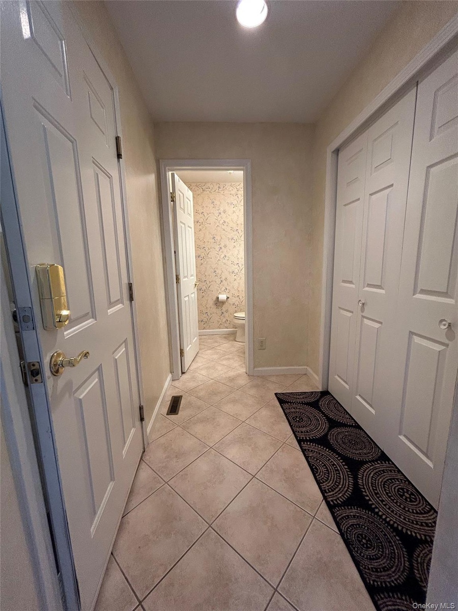 - Bathroom featuring wallpapered walls and light tile patterned floors