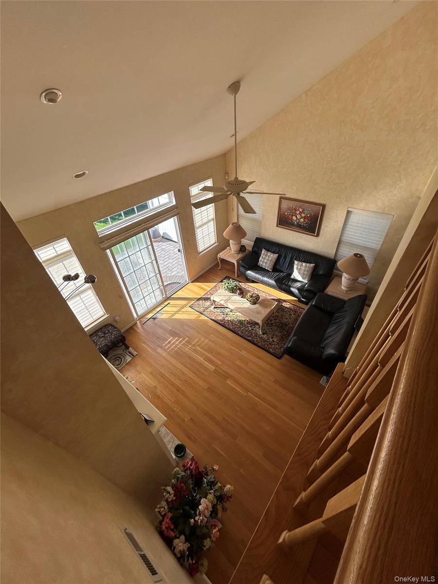 - Living area featuring wood finished floors, ceiling fan, and a high ceiling