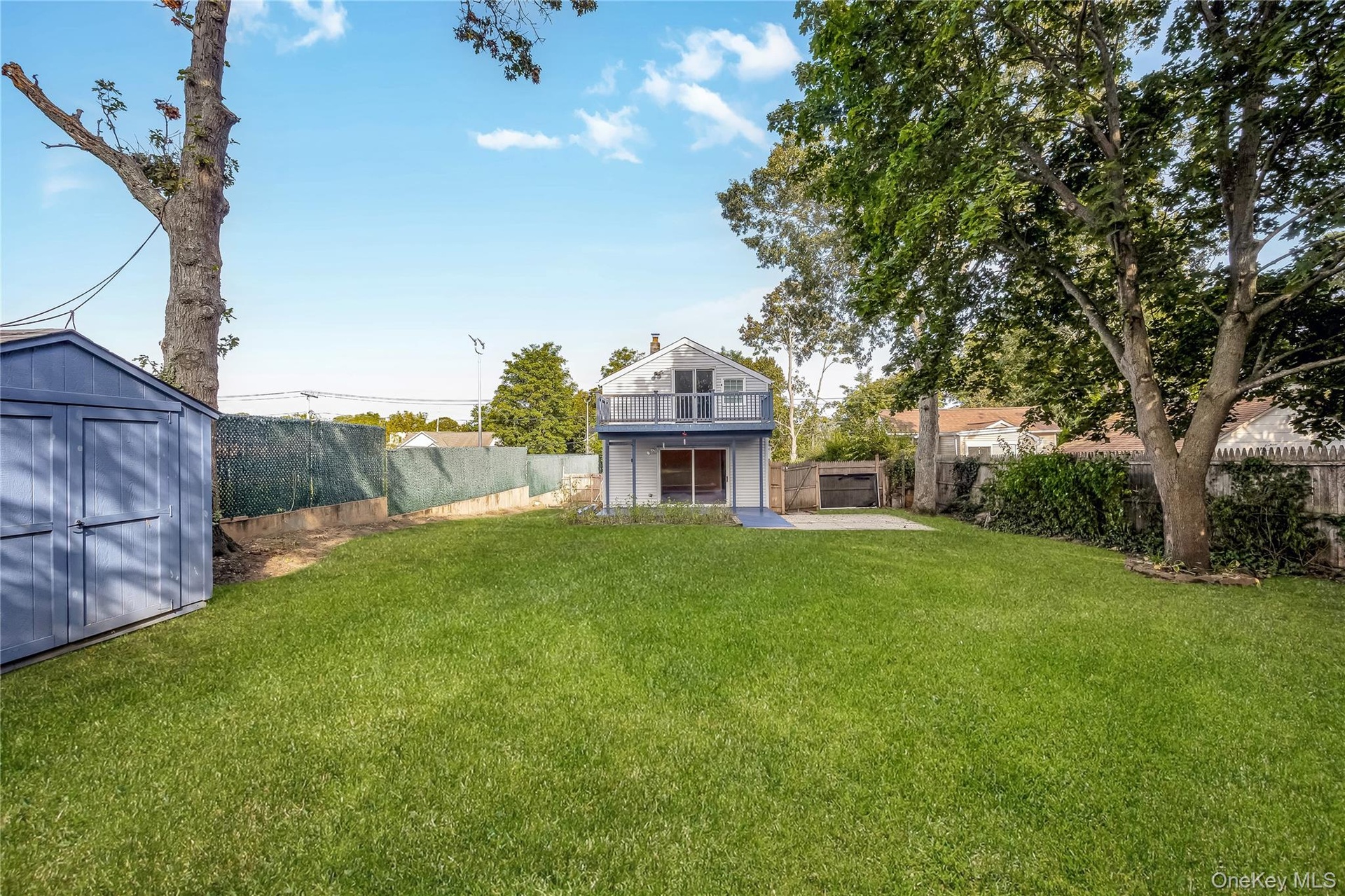- Fenced backyard with a patio, a shed, and a balcony