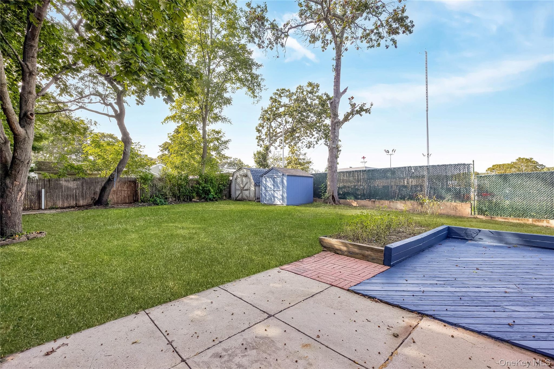 - Fenced backyard with a patio and a shed