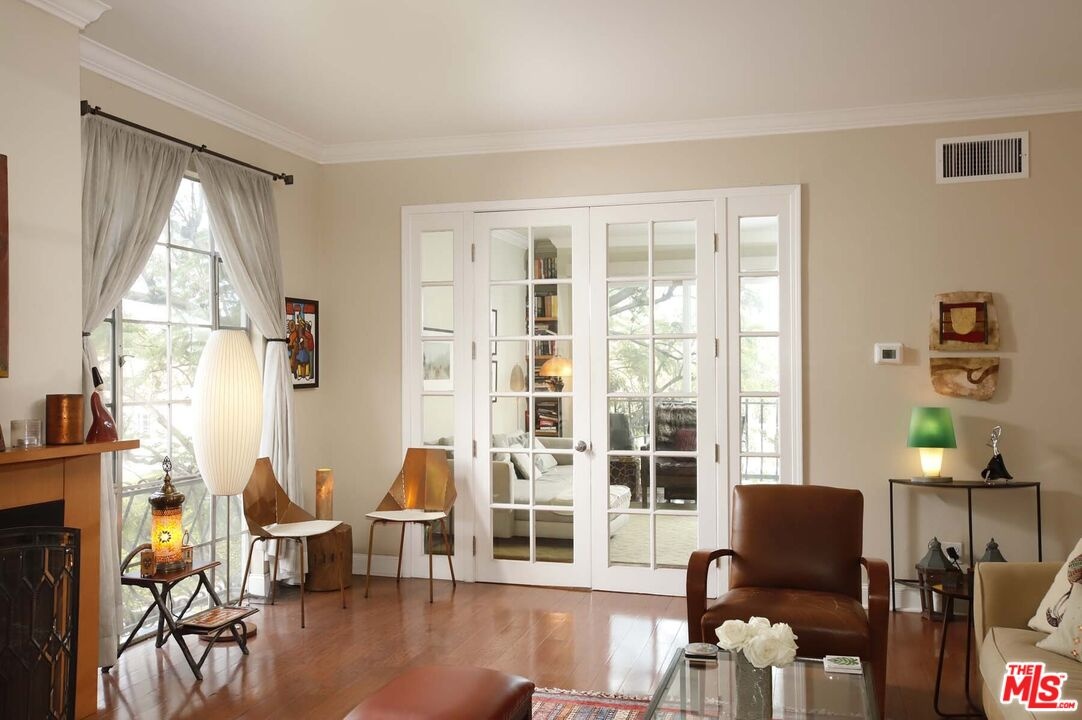 DescriptionBeautiful and spacious 2 bedroom 2 bath condo located in a desirable Beverly Grove location, close to The Four Seasons, Beverly Hills, West Hollywood, Bristol Farms and Cedars-Sinai Medical Center. Charm and sophistication abound throughout the versatile open floor plan, highlighted by crown moldings, rich wood floors, mantled fireplace and is bathed in natural light from the floor up windows. You'll love preparing meals in the gourmet kitchen which features stainless steel appliances and more than ample counters and storage. Highlights of the spacious primary suite include a spa-like bathroom with dual vanity, large tub with separate shower and two very sizable closets with the walk-in leading to the conveniently located laundry room. The equally spacious second bedroom with stylish French doors can also be used as a media room or office, has a large walk-in closet and features a sliding glass door that leads out to a lovely balcony. Condos in this building sell quickly as there are only 6 dwellings, all corner units, and the location can't be beat! Seller is willing to contribute towards buyers temporary interest rate buy-down with approved lender.Amenities- Balcony