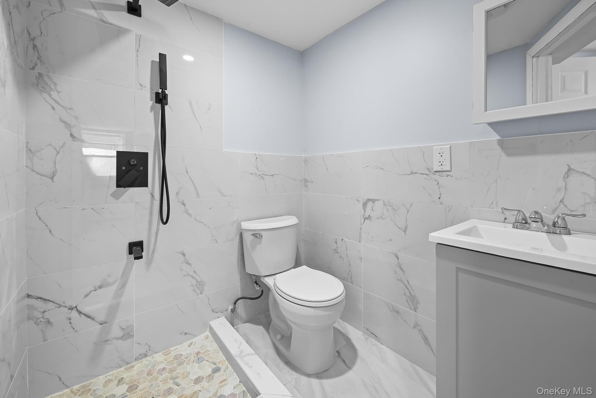 - Bathroom with a marble finish shower, vanity, and tile walls