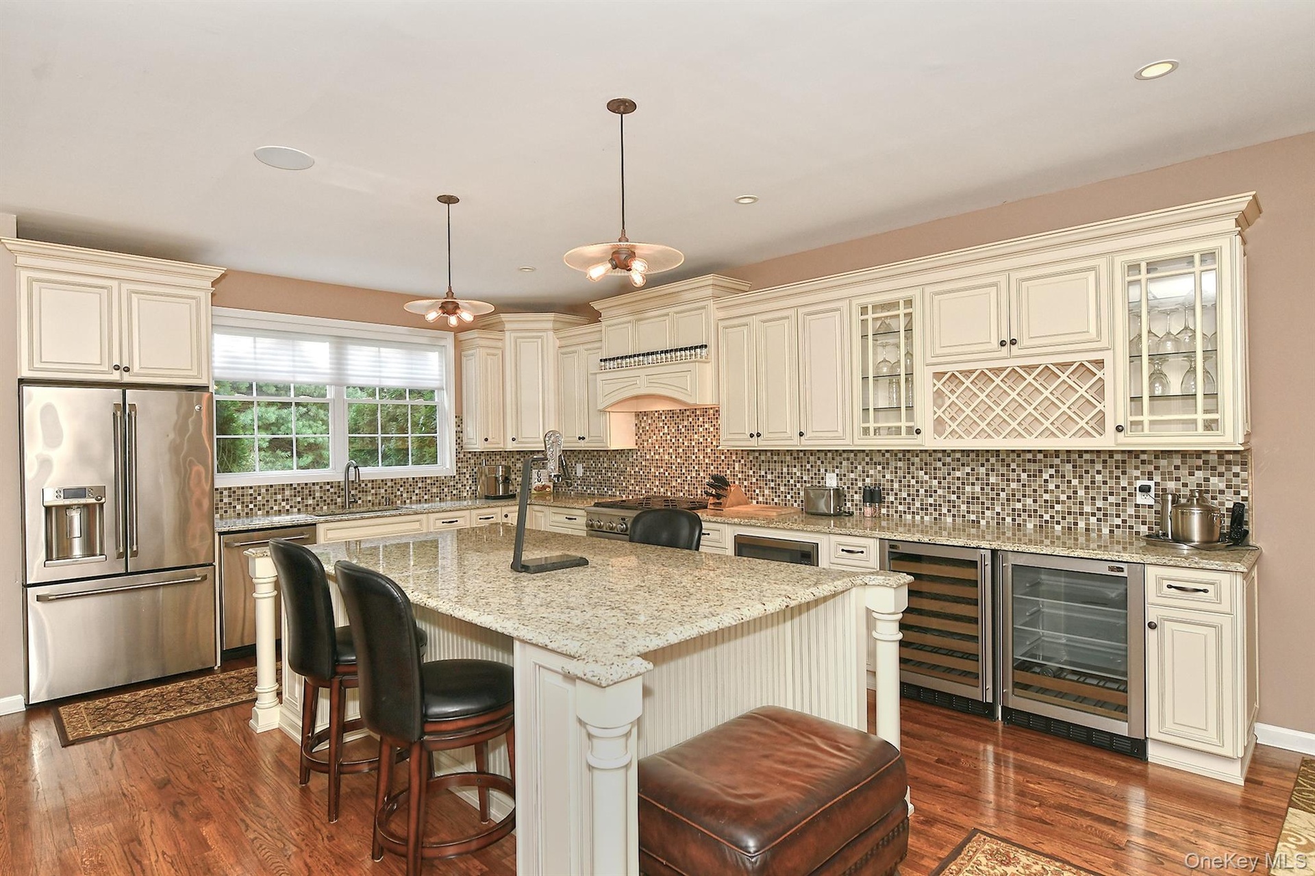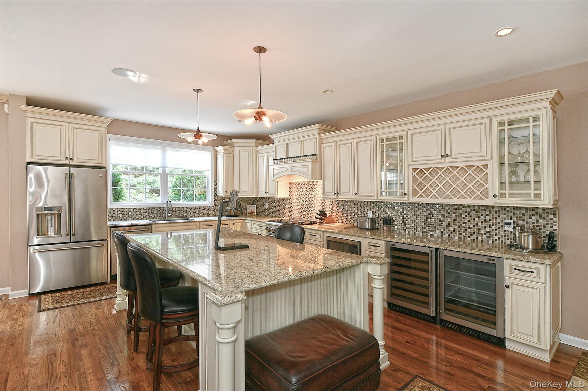 - Kitchen with cream cabinets, beverage cooler, light stone countertops, and decorative backsplash