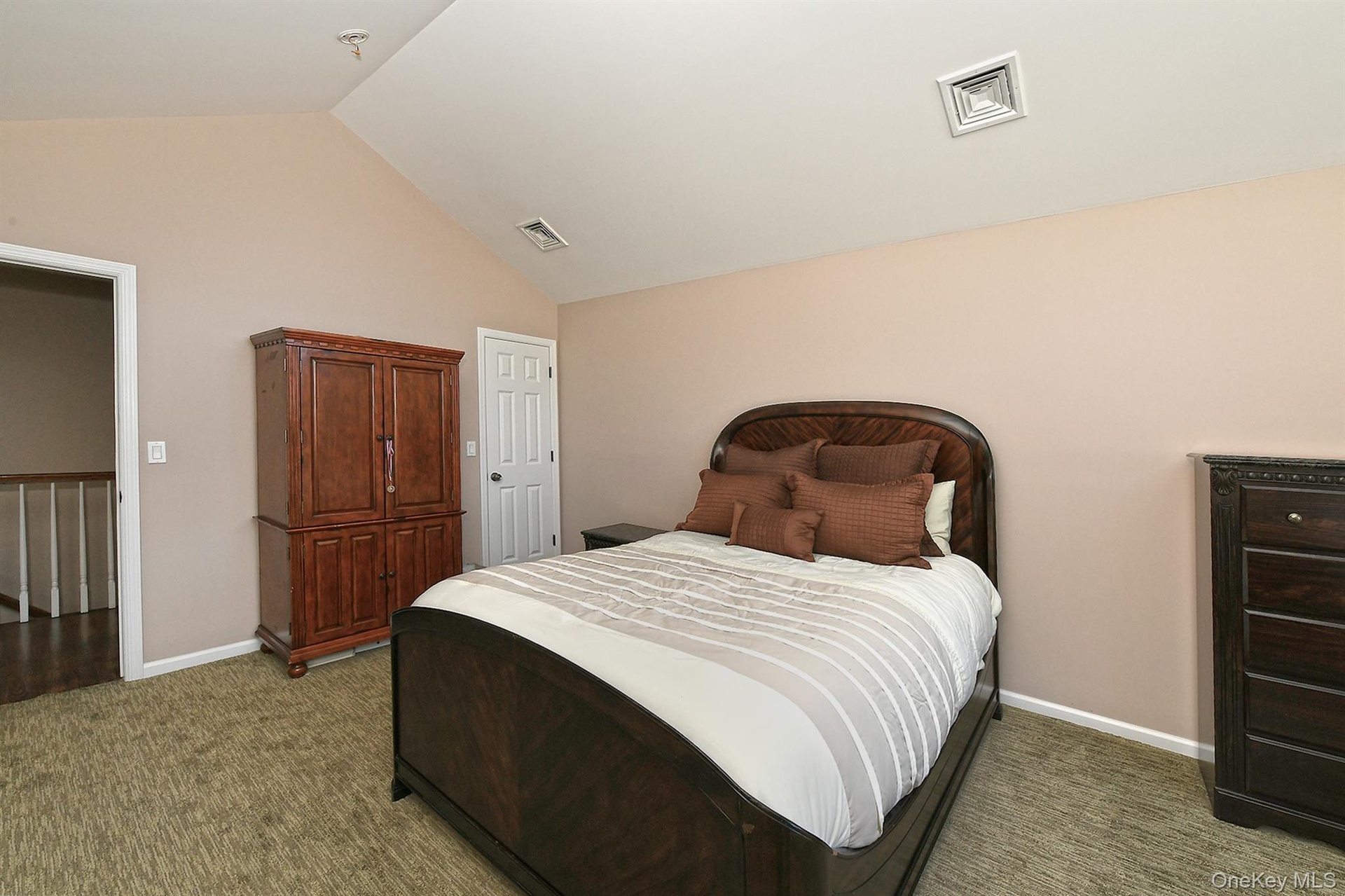 - Carpeted bedroom with baseboards and vaulted ceiling