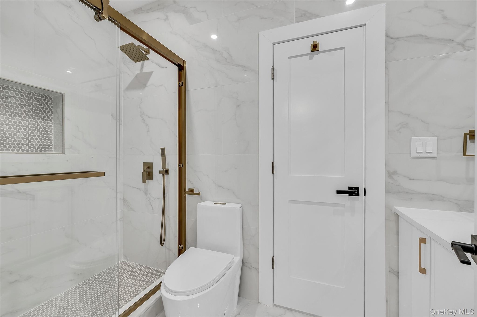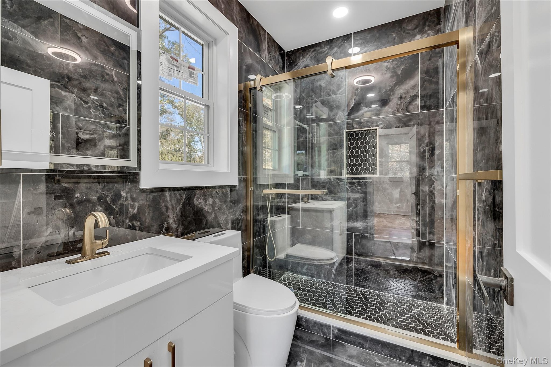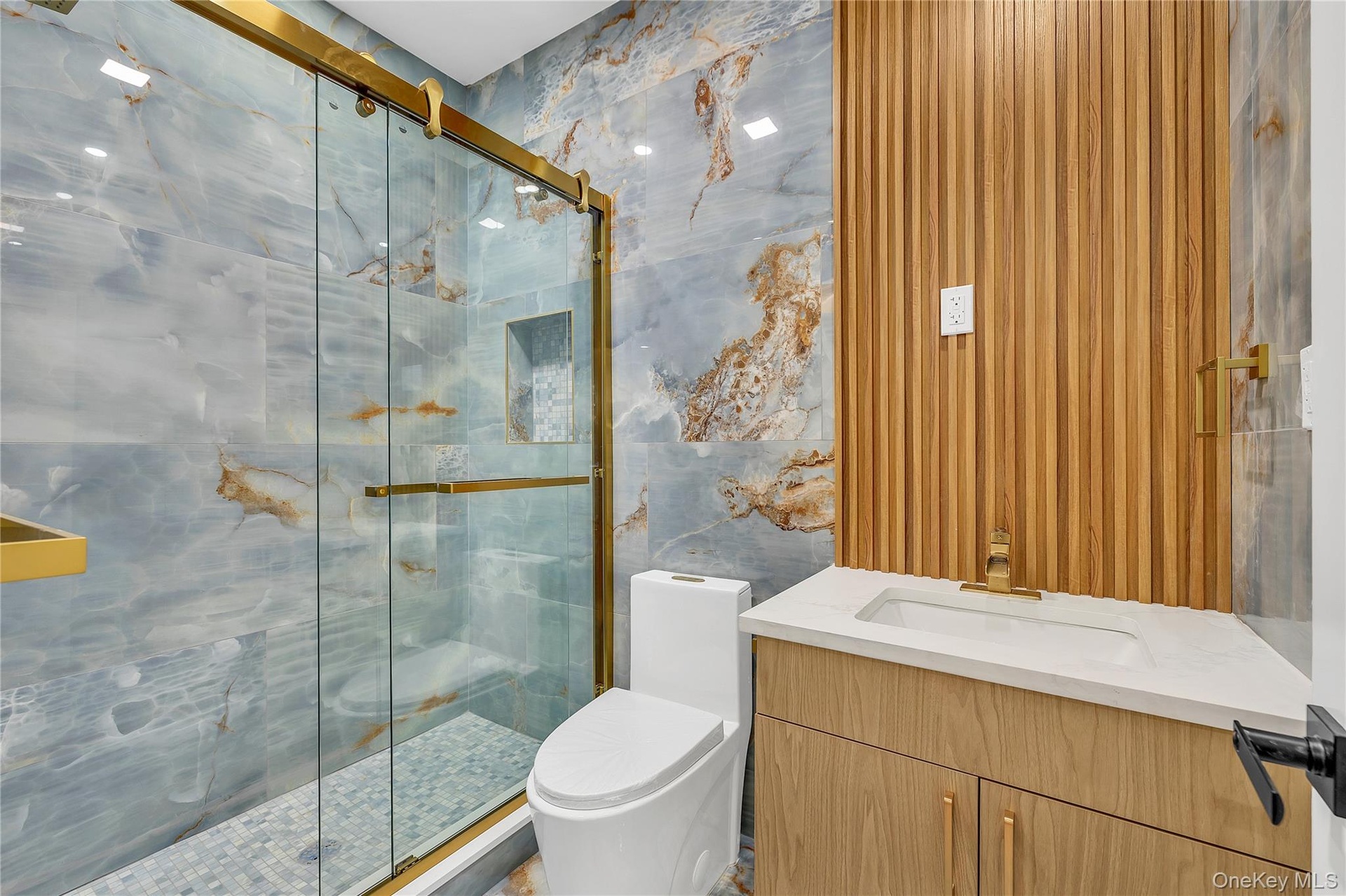 - Bathroom with tile walls, stone wall, a marble finish shower, vanity, and recessed lighting