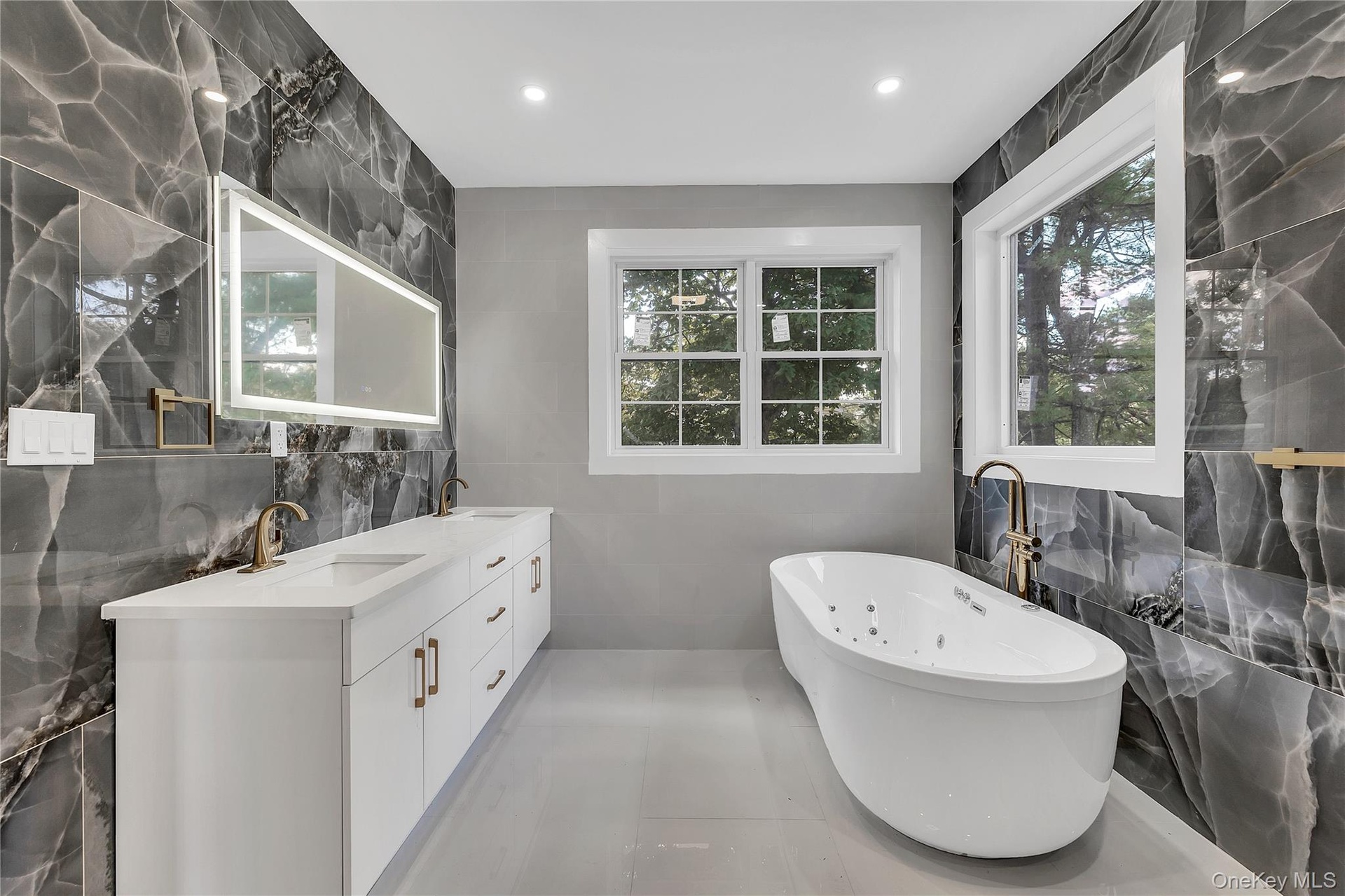 - Bathroom with tile walls, a freestanding tub, double vanity, recessed lighting, and light tile patterned floors