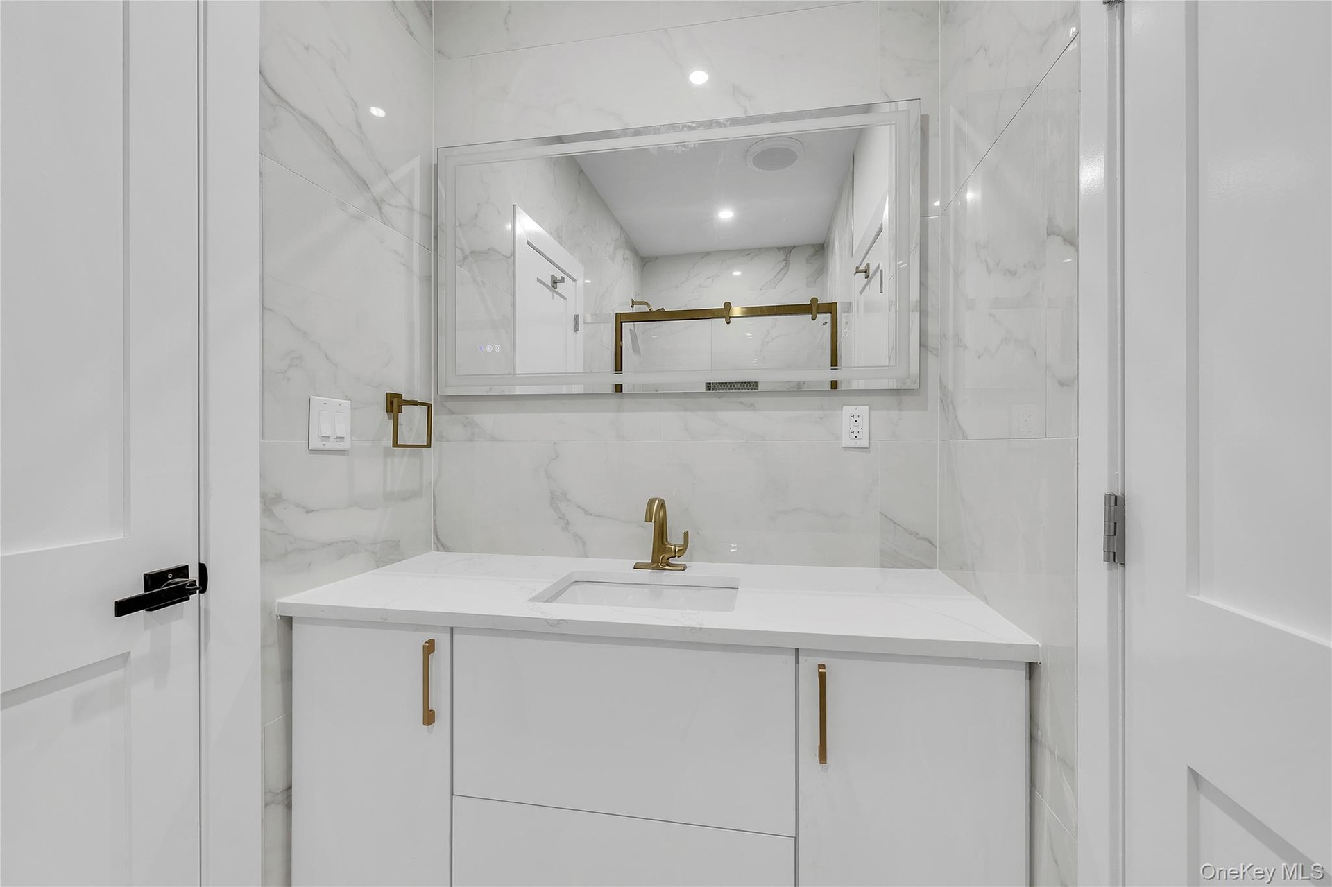 - Bathroom featuring a marble finish shower, vanity, and tile walls