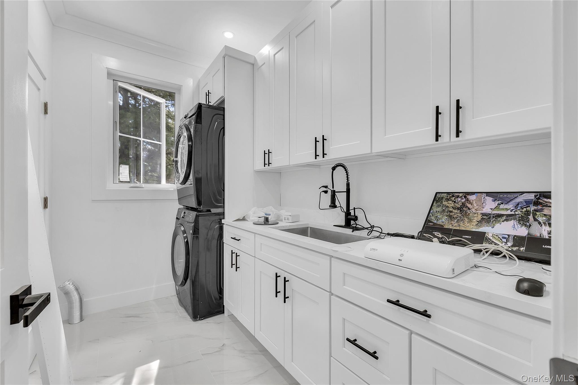 - Laundry room with stacked washing machine and dryer, cabinet space, light marble finish floors, and recessed lighting