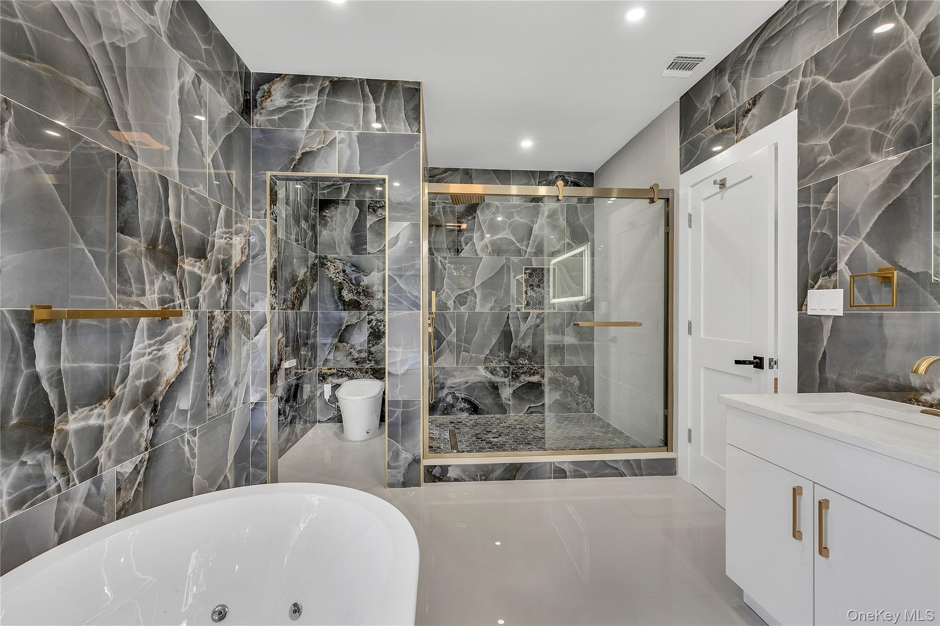 - Bathroom with vanity, tile walls, and a marble finish shower