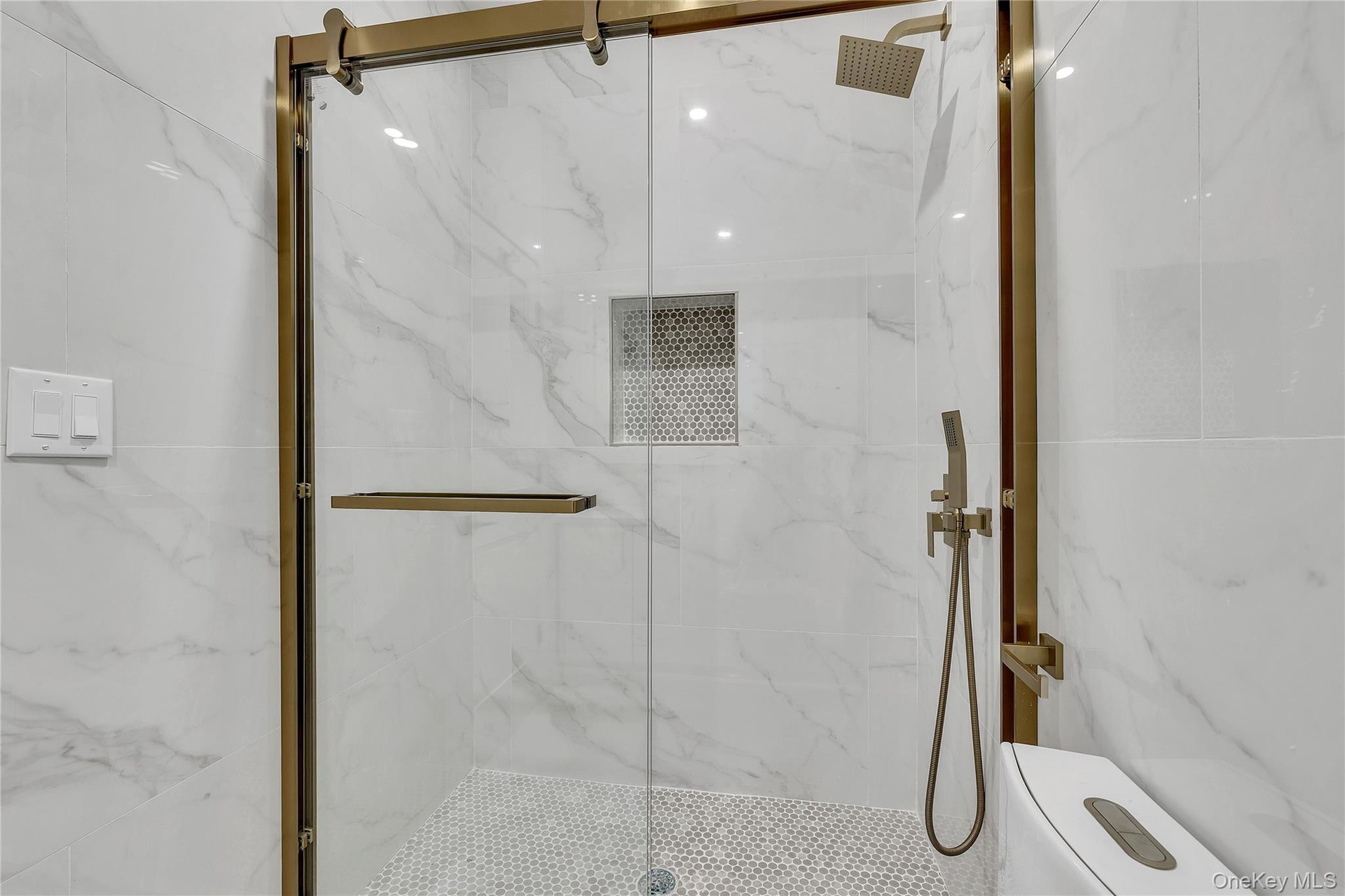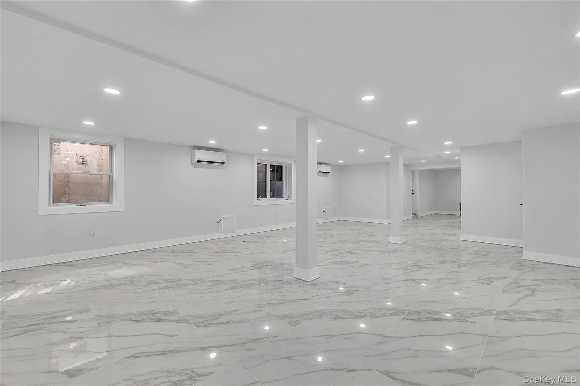- Finished below grade area with recessed lighting and light marble finish flooring