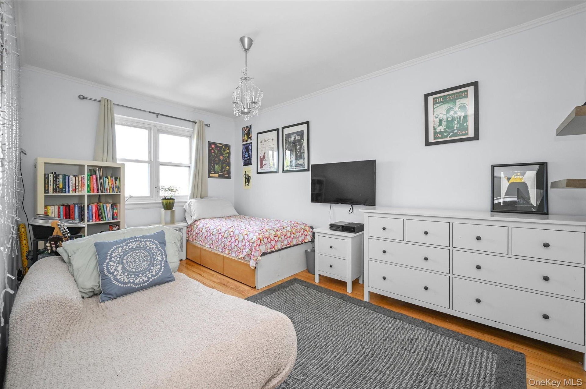 - Bedroom featuring light wood-style flooring, crown molding, and a chandelier