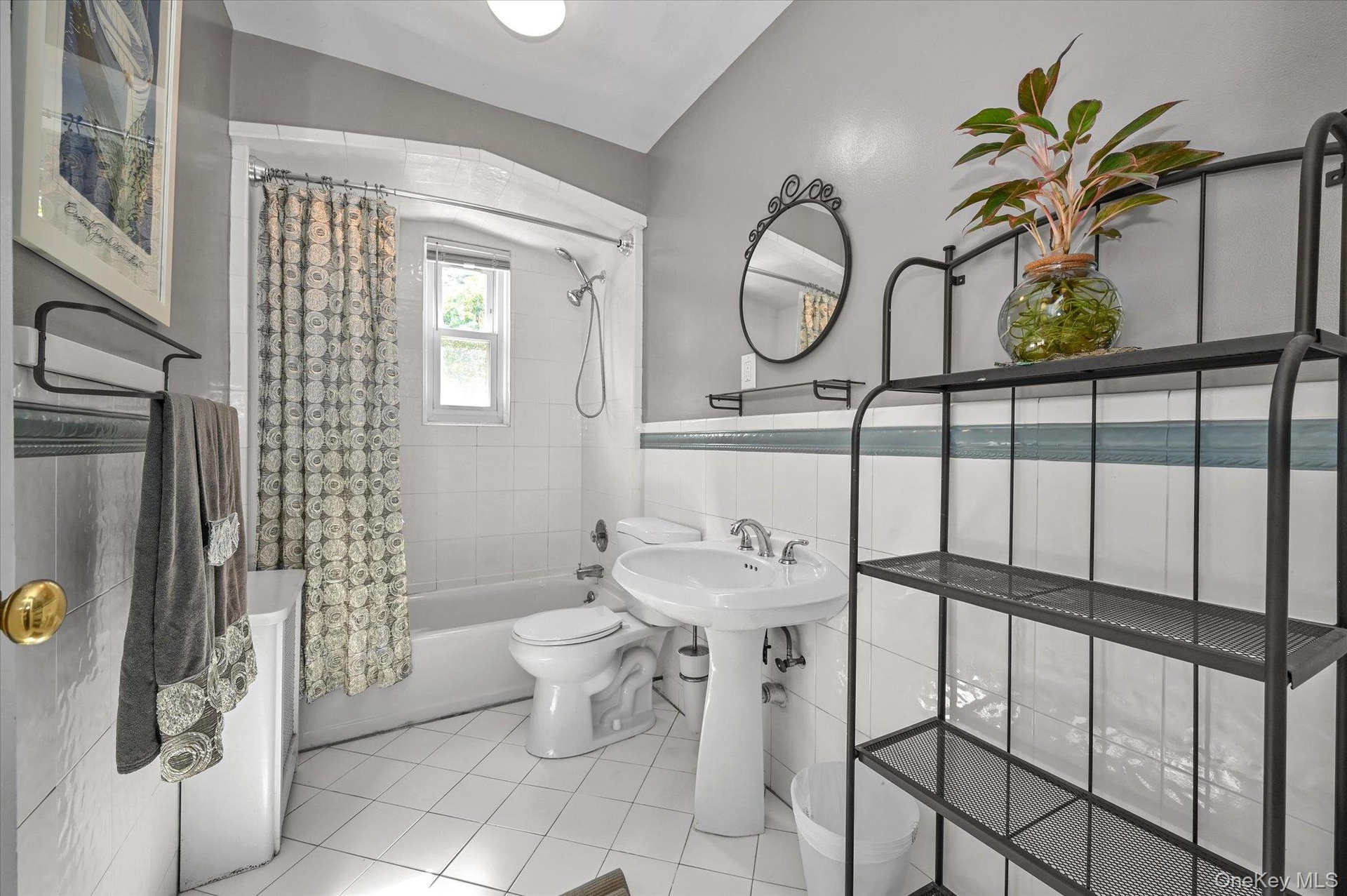 - Full bathroom featuring shower / bath combo, light tile patterned floors, tile walls, and wainscoting