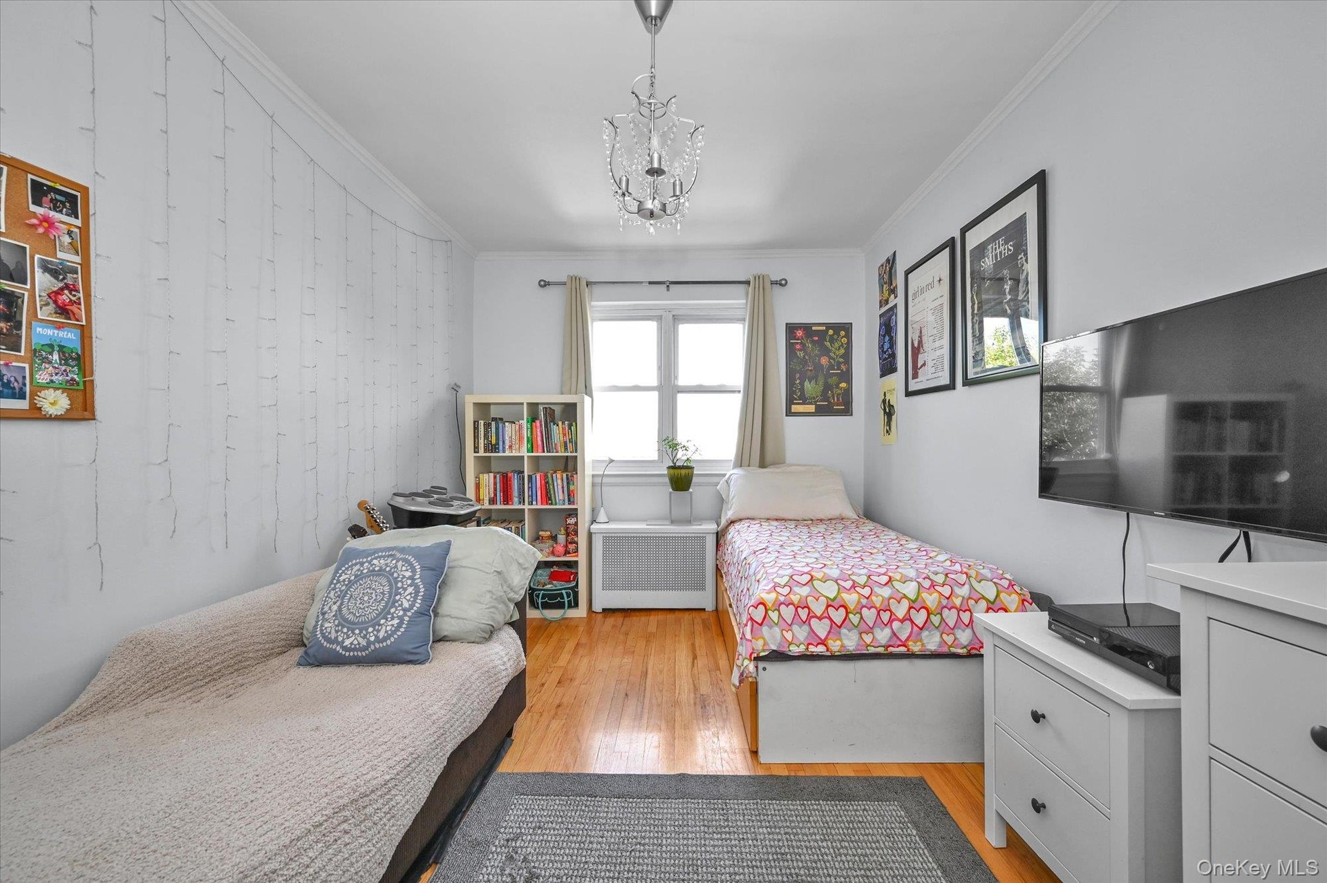 - Bedroom featuring light wood-style floors, ornamental molding, radiator, and a chandelier