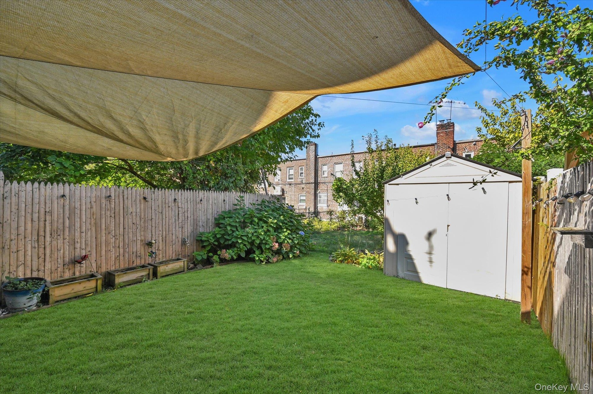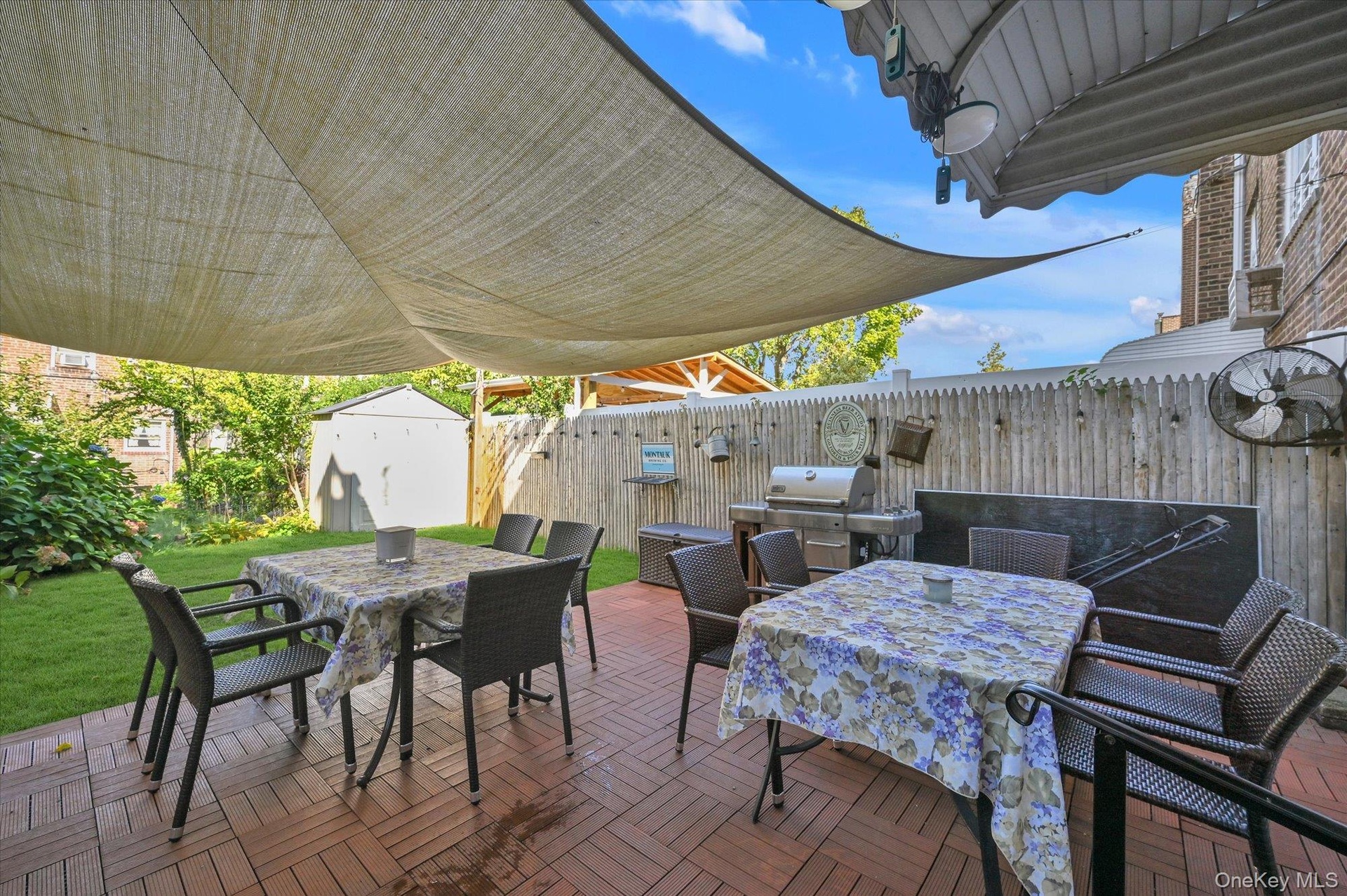 - Fenced backyard featuring outdoor dining area, a shed, a patio area, and a grill
