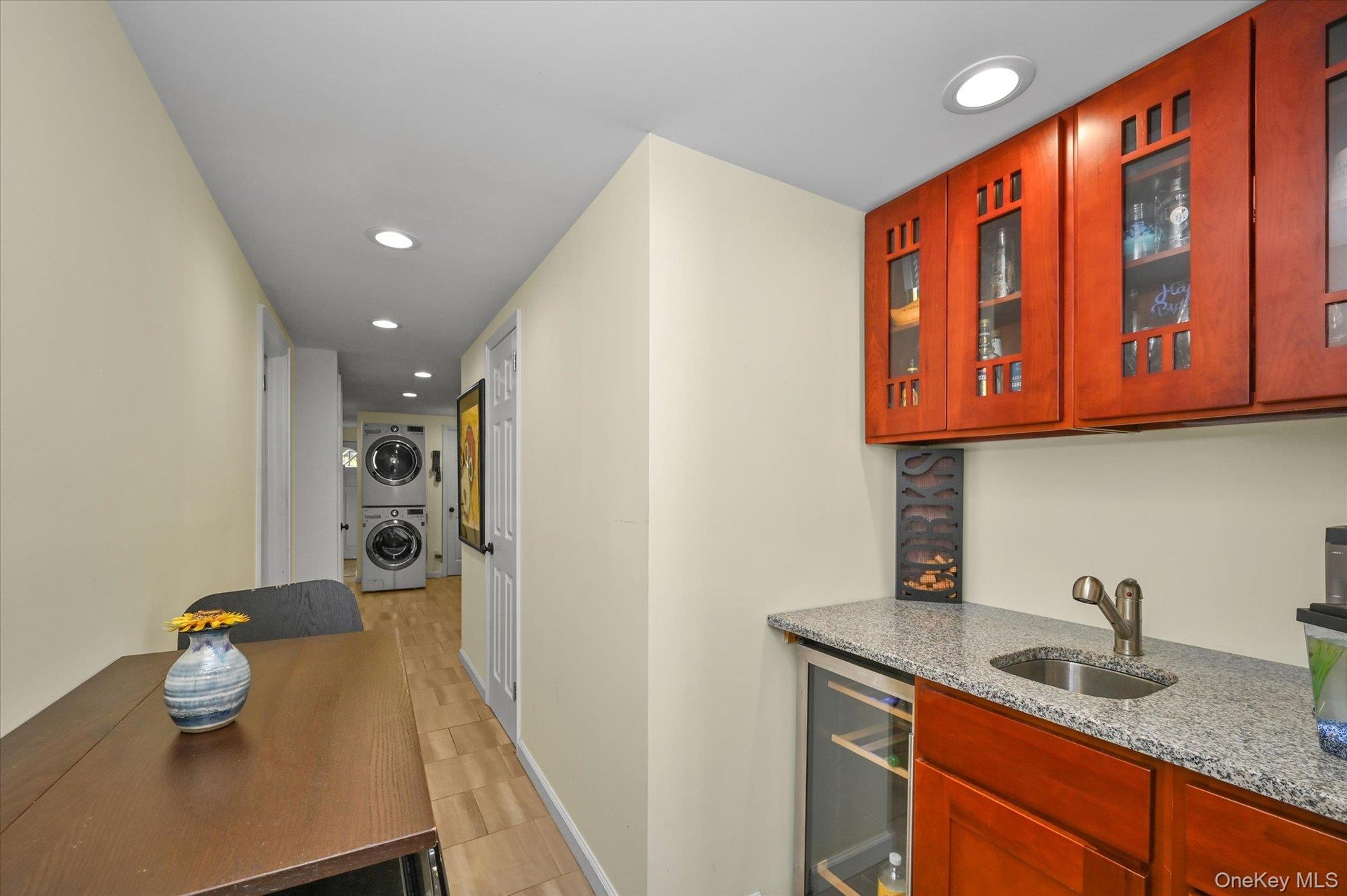 - Indoor wet bar with glass insert cabinets, light stone counters, recessed lighting, beverage cooler, and stacked washer and clothes dryer