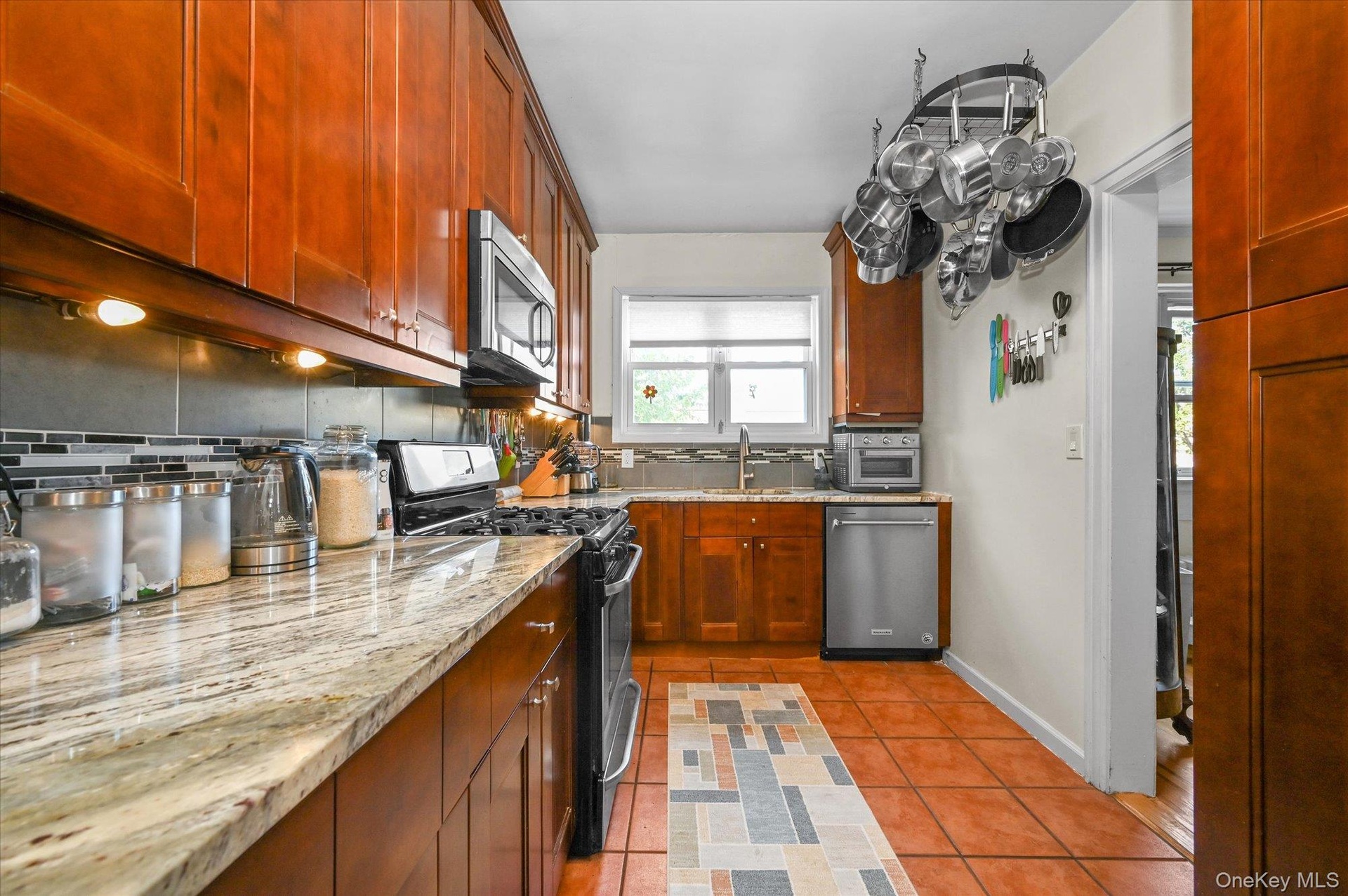 - Kitchen with stainless steel appliances, backsplash, light stone counters, and light tile patterned floors