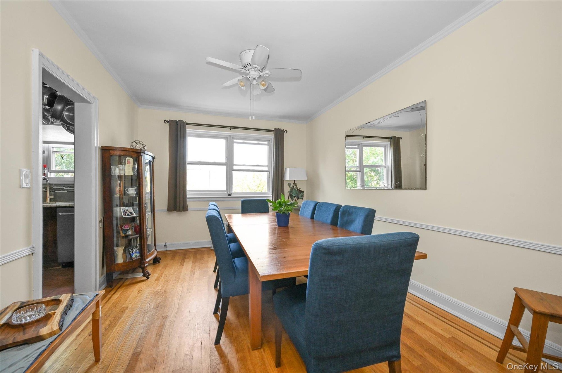 - Dining room with crown molding, light wood-style floors, and a ceiling fan
