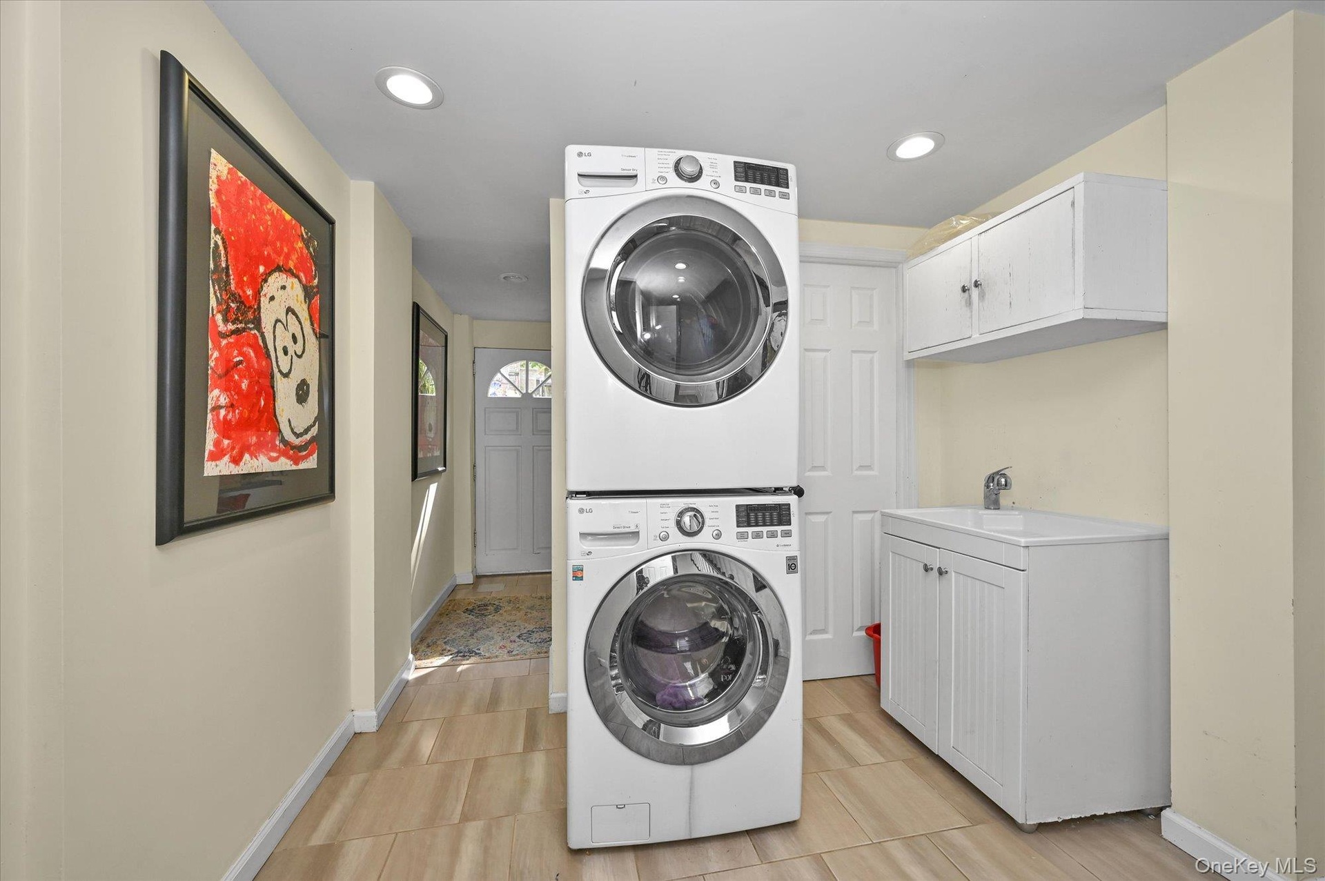 - Washroom featuring cabinet space, recessed lighting, and stacked washer / drying machine