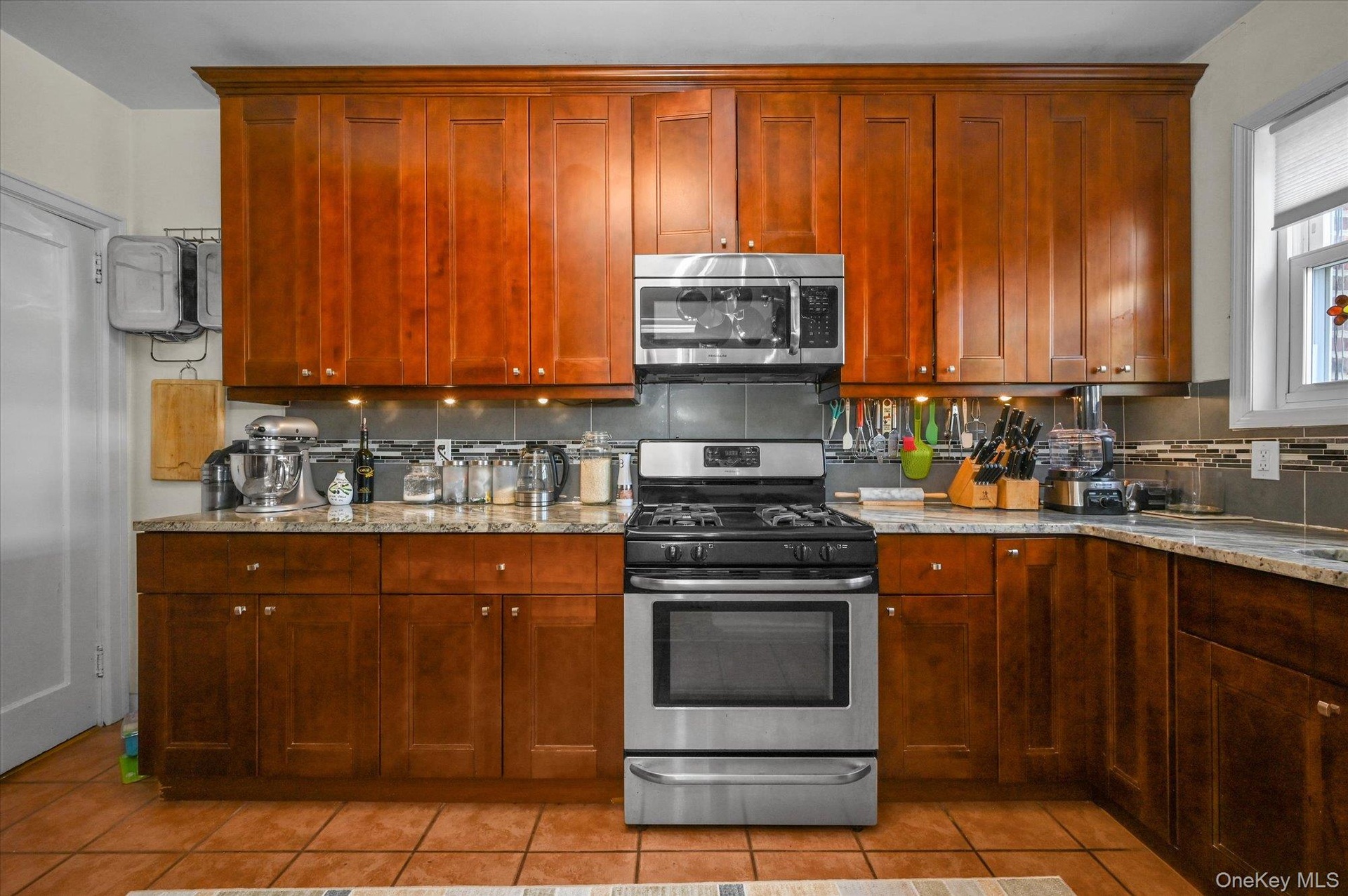 - Kitchen featuring stainless steel appliances, backsplash, light tile patterned flooring, and light stone counters