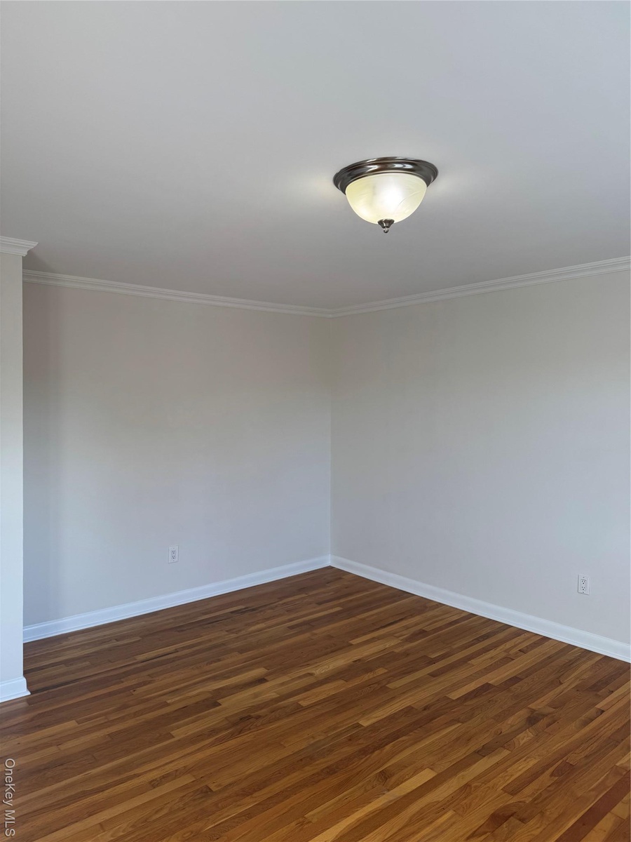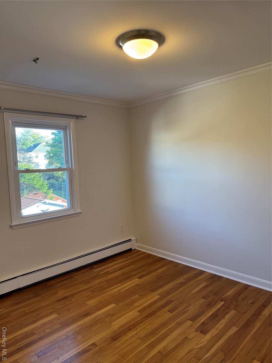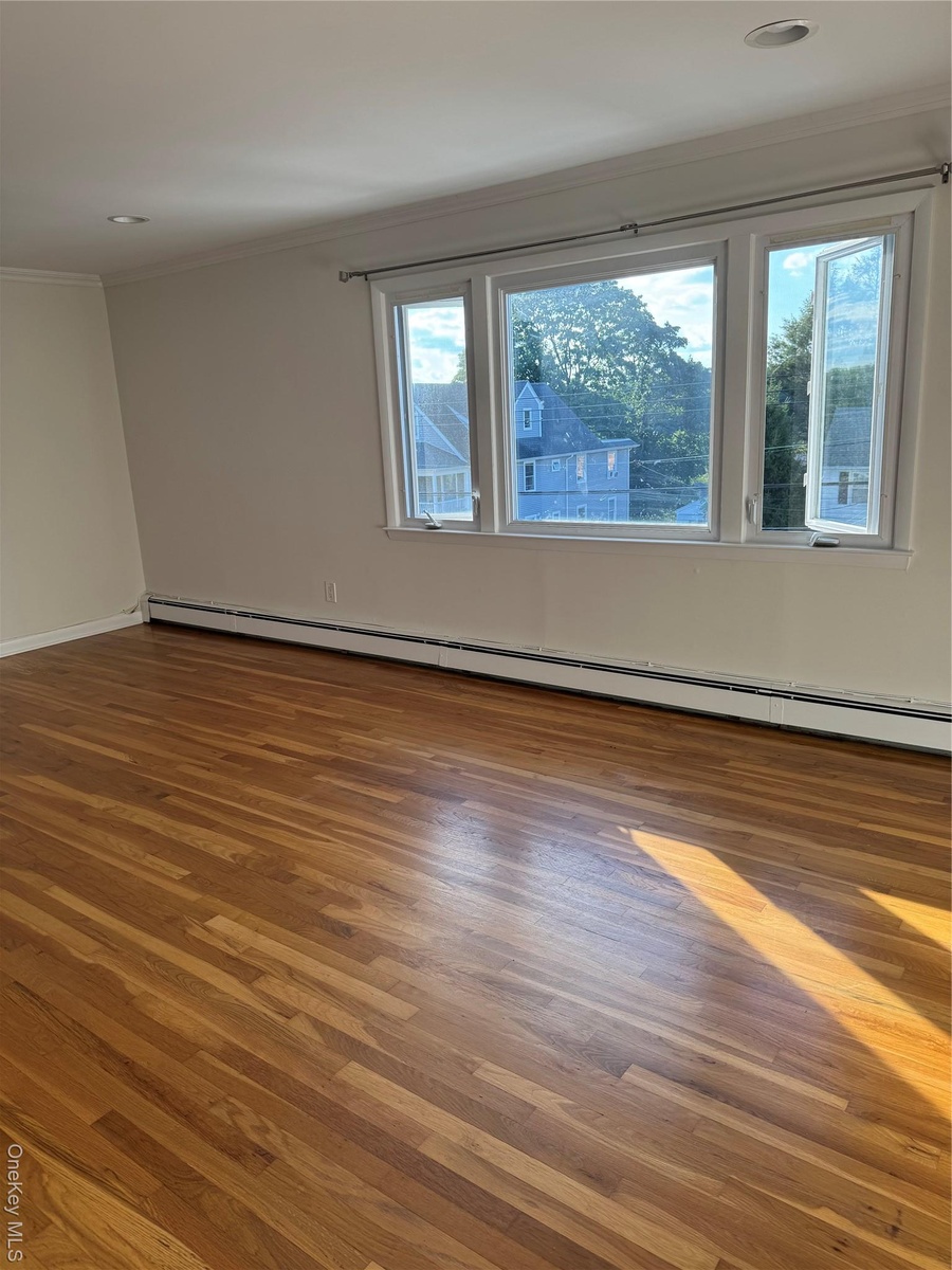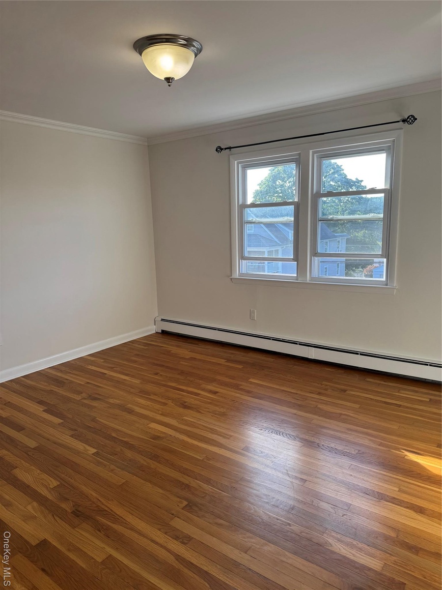 - Empty room with baseboard heating, wood finished floors, and ornamental molding