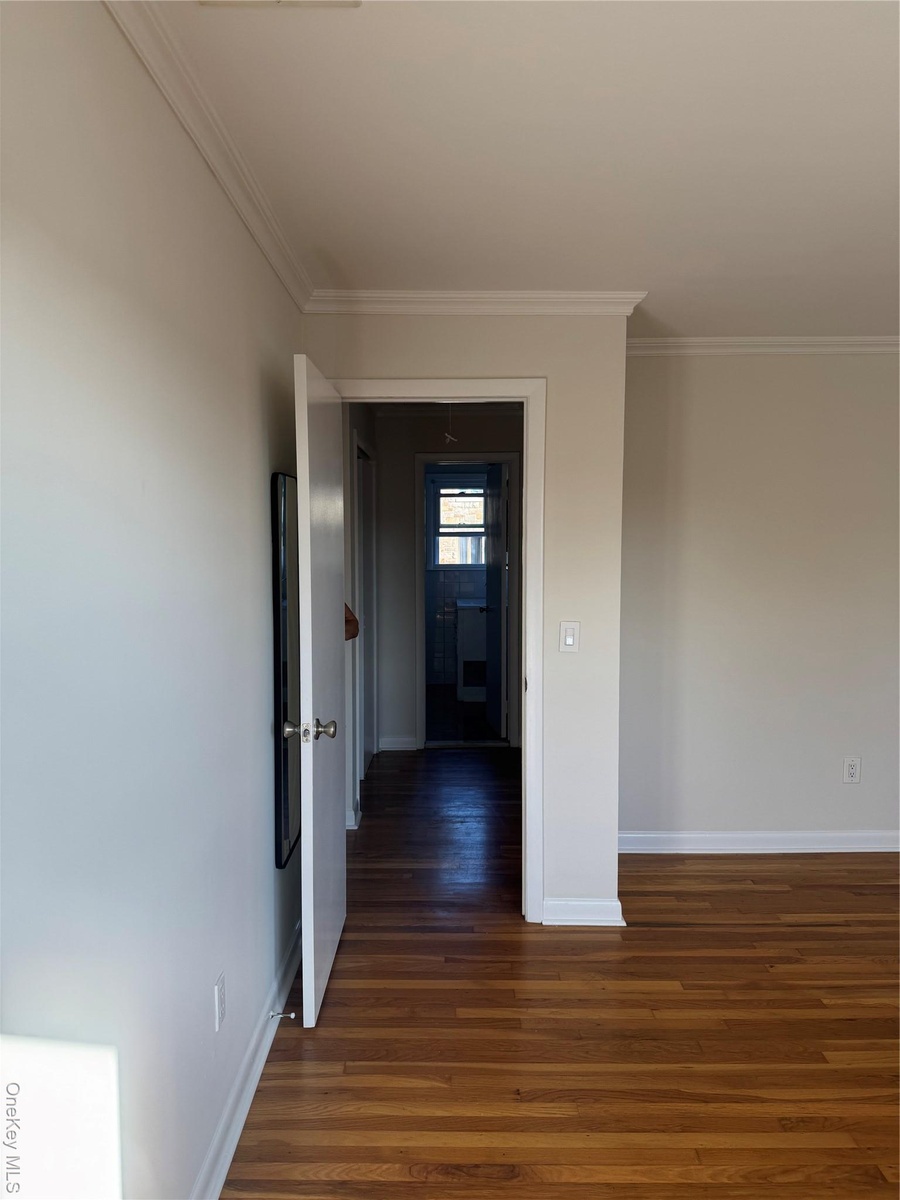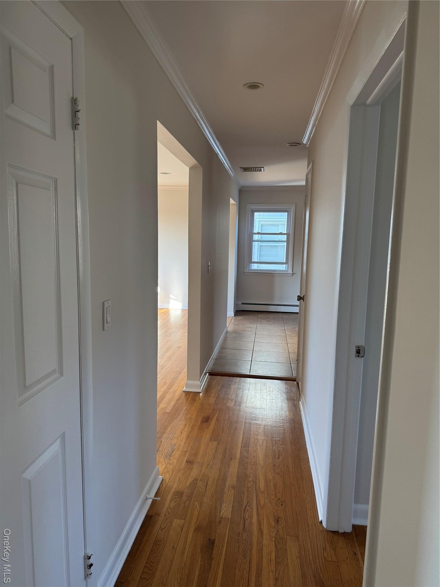 - Corridor featuring wood finished floors, crown molding, and a baseboard radiator