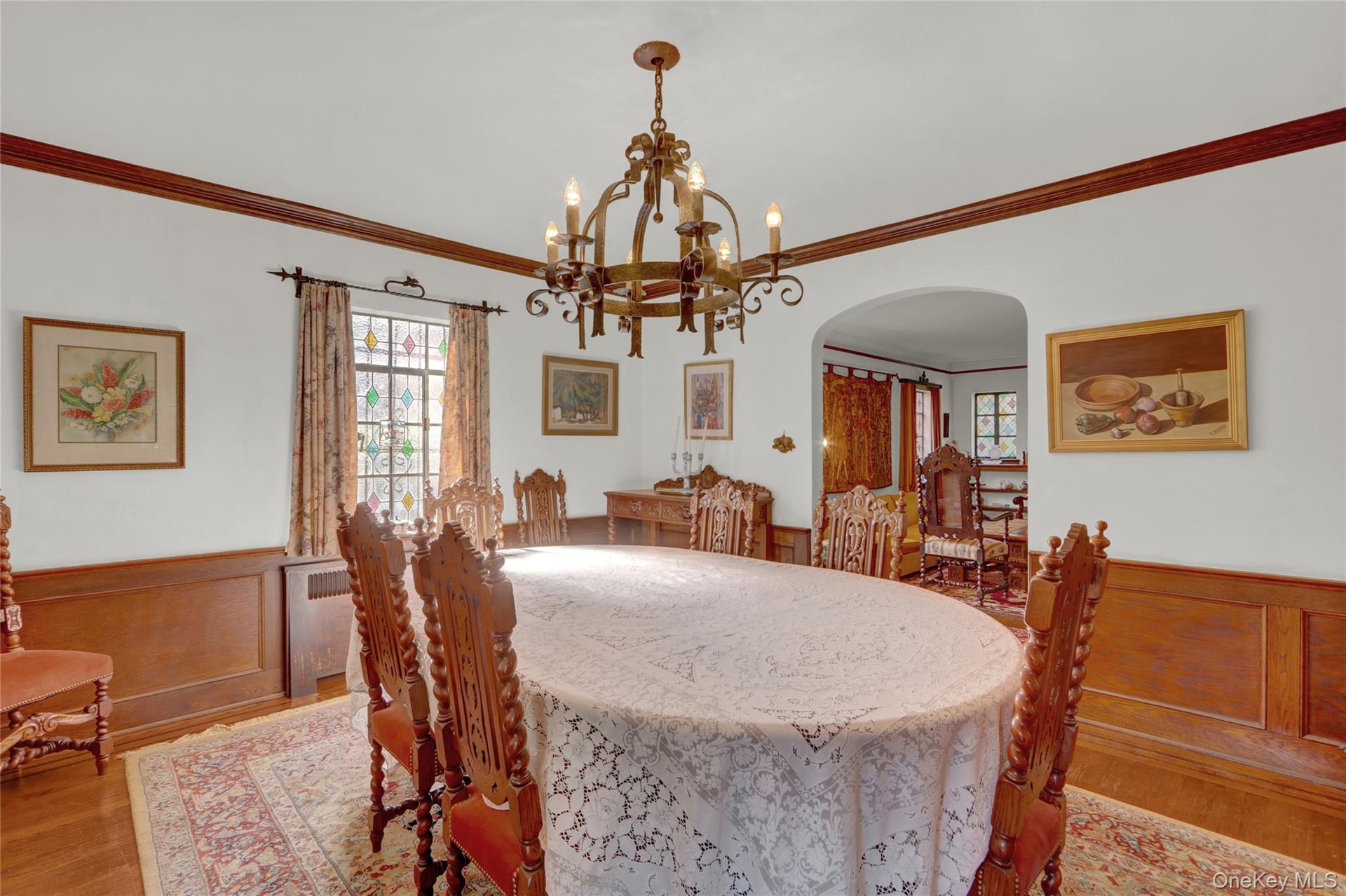 - Dining room with wainscoting, arched walkways, wood finished floors, crown molding, and a chandelier