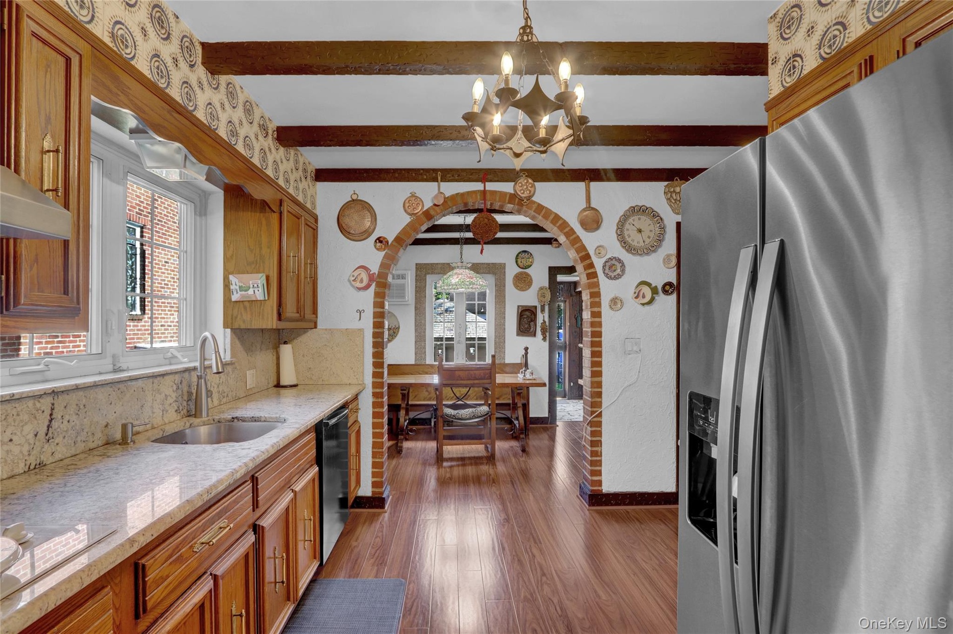- Kitchen with stainless steel fridge, light stone counters, arched walkways, backsplash, and dark wood-style flooring