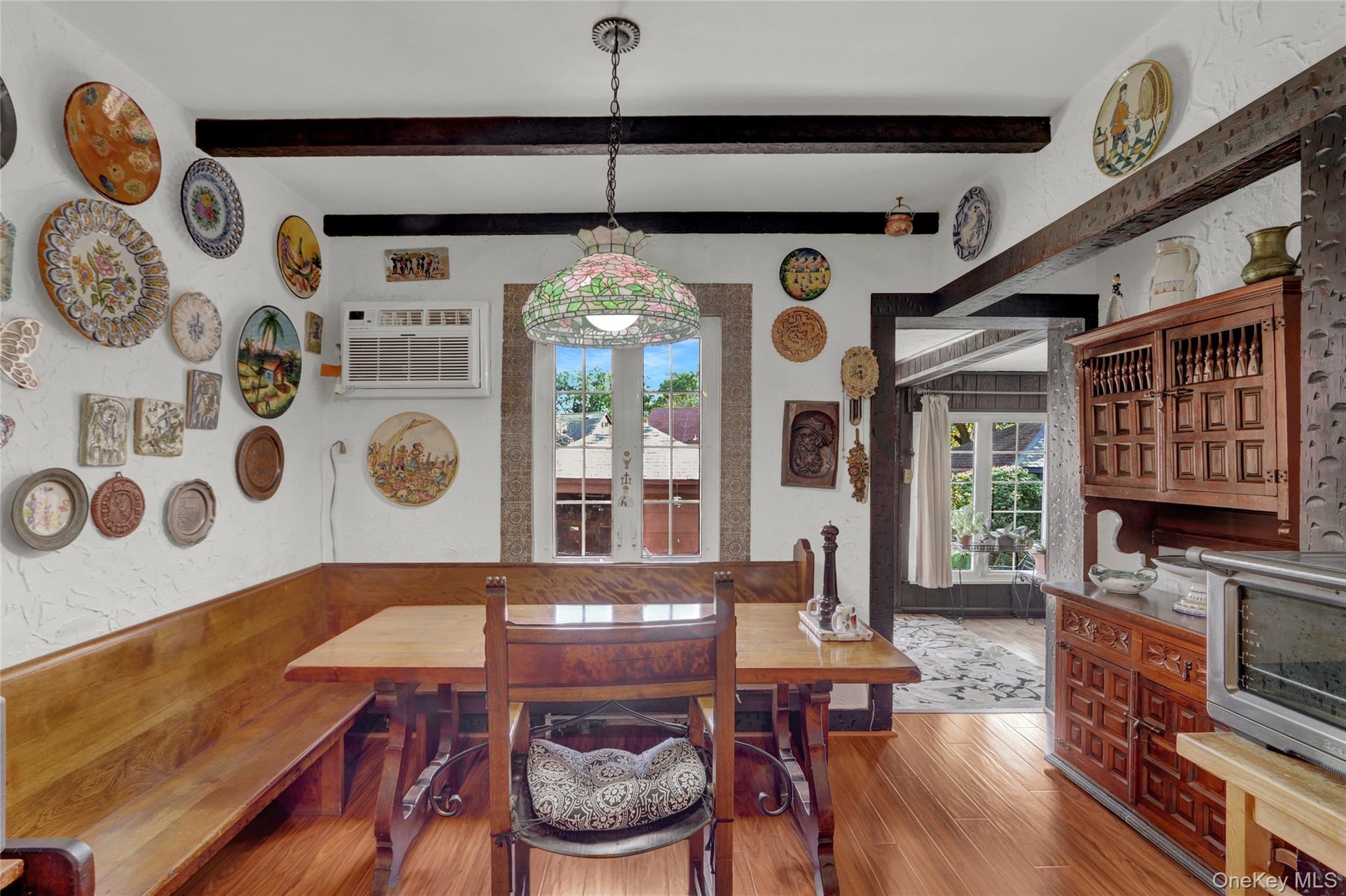 - Dining area with french doors, wood finished floors, a textured wall, beam ceiling, and an AC wall unit