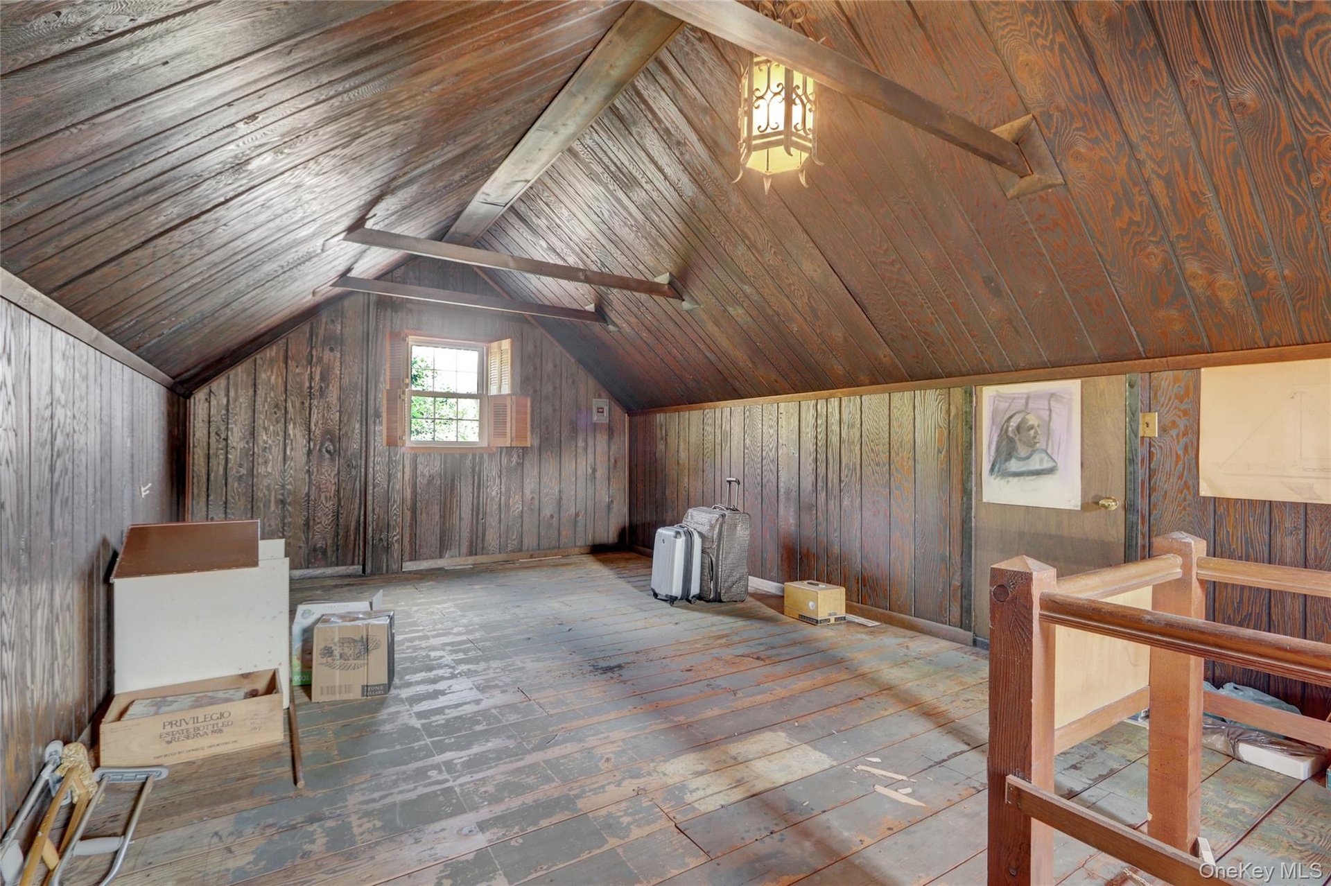 - Bonus room with hardwood / wood-style flooring, wood walls, and wood ceiling