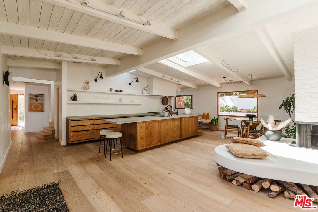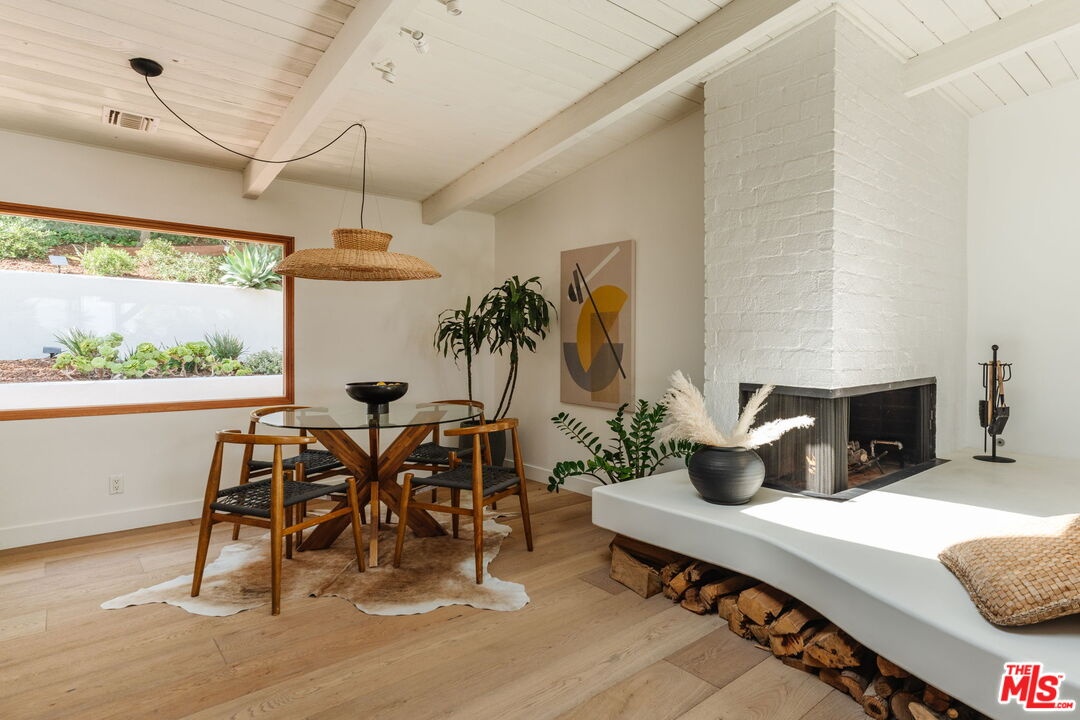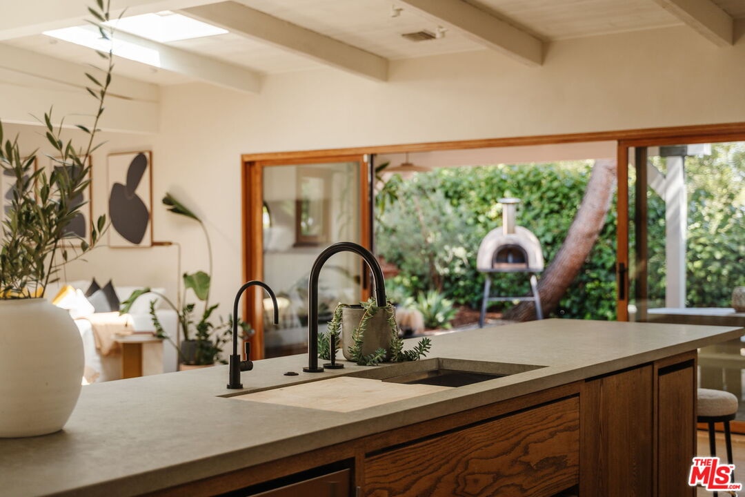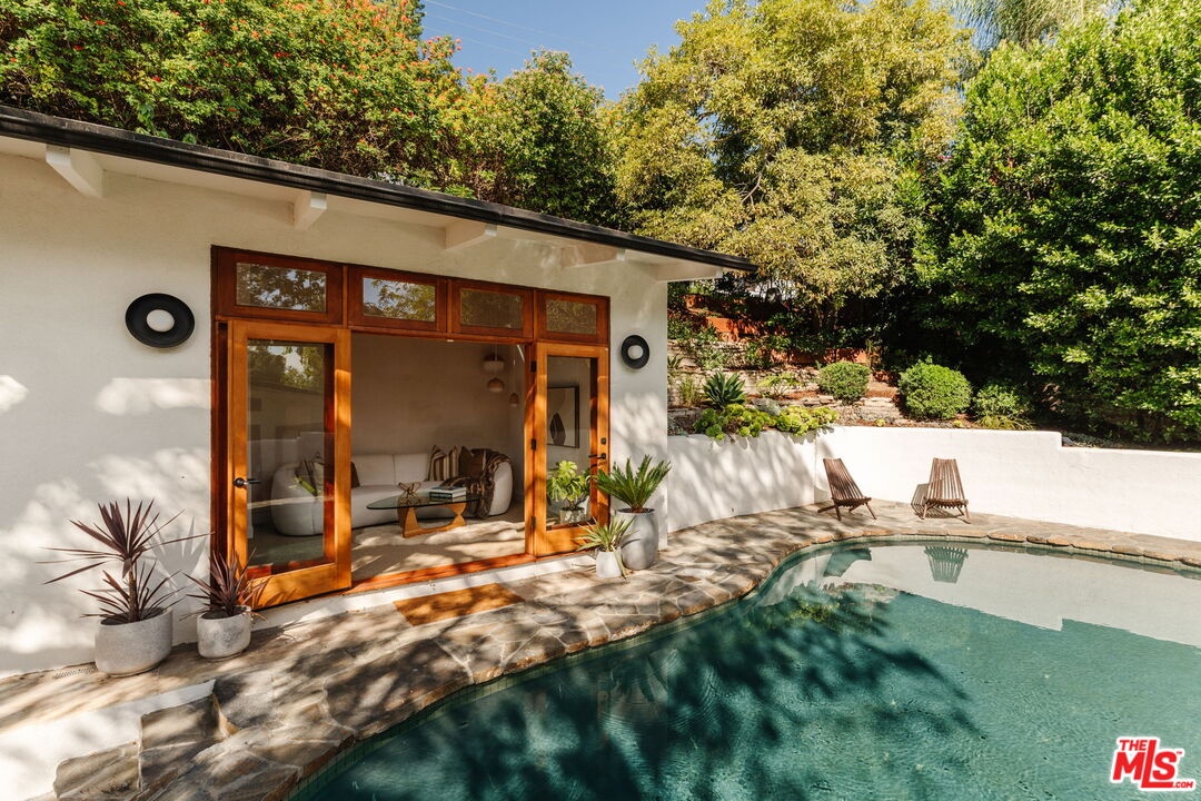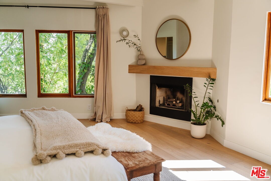 Tucked away on a peaceful tear-drop street in the Hollywood Hills, 2145 Sunset Crest isn't just a home, it's a retreat. From the moment you arrive, the world feels quieter here, more private, as though the city has slipped just far enough away to give you space to breathe. Step inside, and sunlight floods the open floor plan, pouring through skylights and expansive glass doors that blur the line between indoors and out. The textures immediately draw you in, Roman clay walls that radiate warmth, French white oak floors that ground the space, and exposed beams that whisper of timeless mid-century design. At the heart of it all, a striking peninsula fireplace anchors the living room, inviting late-night conversations and slow mornings with coffee. The chef's kitchen is where stories are shared and meals come to life, an oversized limestone island ready for friends to gather around, premium appliances that make cooking effortless, and a hidden walk-in pantry to keep it all beautifully uncluttered. Slide open the glass doors, and suddenly you're dining al fresco on the side patio, framed by views of the mountains glowing in the evening light. Out back, your private oasis awaits. A sparkling pool reflects the sky above, a cedar hot tub promises to melt the day away, and a wood-fired pizza oven turns every night into a gathering. It's the kind of backyard that begs for celebrations yet feels like your own private sanctuary.When the day is done, retreat upstairs to the primary suite, where a fireplace sets a romantic tone and a spa-like bathroom pampers with dual sinks, a freestanding soaking tub, and a glass-enclosed shower. Each of the additional bedrooms and bonus spaces, whether an office, pool house, or guest retreat, offers a quiet corner to recharge or create.And while it feels worlds away, you're still moments from it all: the energy of the Sunset Strip, the trails of Fryman & Runyon Canyons, the charm of Studio City, and the scene in West Hollywood. Even Wonderland Elementary, one of LA's most beloved schools, is just around the corner.2145 Sunset Crest isn't just a house in the hills, it's where life slows down, where design inspires, and where every day feels like a getaway.