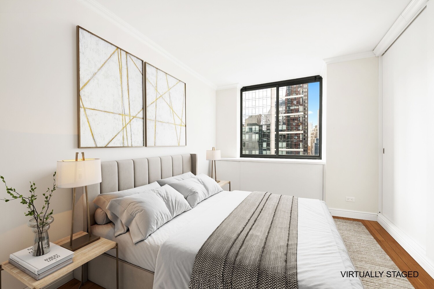 Situated on the 20th floor, this quiet and bright 2 Bedroom/2 Bath condo features a gracious entrance foyer preceding an oversized north-west corner exposure living room offering city views. The living room which is 23 feet in length can easily accommodate a large dining table and has a wonderful west-facing balcony. The renovated modern kitchen features white shaker-style cabinetry, stainless steel appliances, gorgeous Caesarstone countertops, a white subway tile backsplash and undermount task lighting.