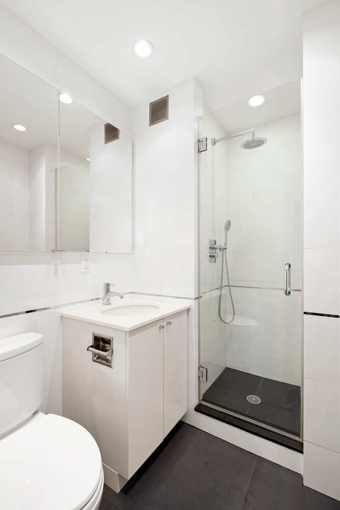 The second bedroom which can accommodate a queen-sized bed faces north and has a large, customized wall closet. The renovated second bathroom has been finished in white porcelain tile and features a modern vanity, a shower stall also with a rain shower, an oversized & extra deep medicine cabinet and a Toto toilet. Additional features of the home include hardwood floors and a coat/utility closet.