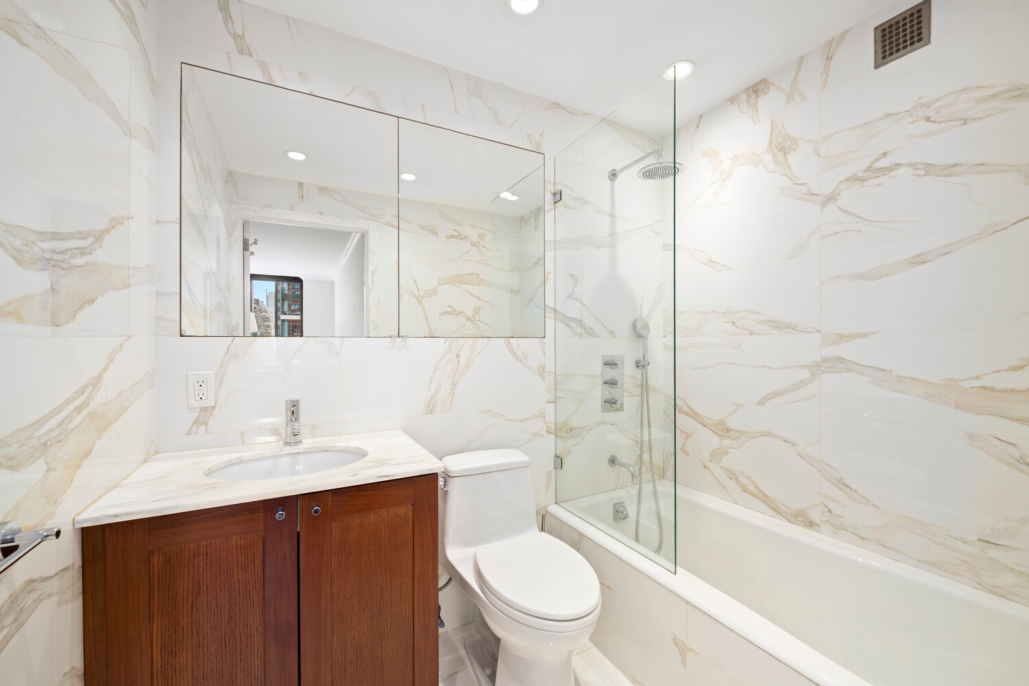 This well-designed apartment offers a wonderful split-bedroom layout. The spacious west-facing primary bedroom with a renovated en-suite bath accommodates a queen size bed and features a wall of customized closets plus another XL customized closet with specialized storage for shoes. The gorgeous primary bathroom has been finished in a striking marbled porcelain tile and features a modern vanity, a bathtub with a rain shower, an extra-deep double medicine cabinet and a Toto toilet.