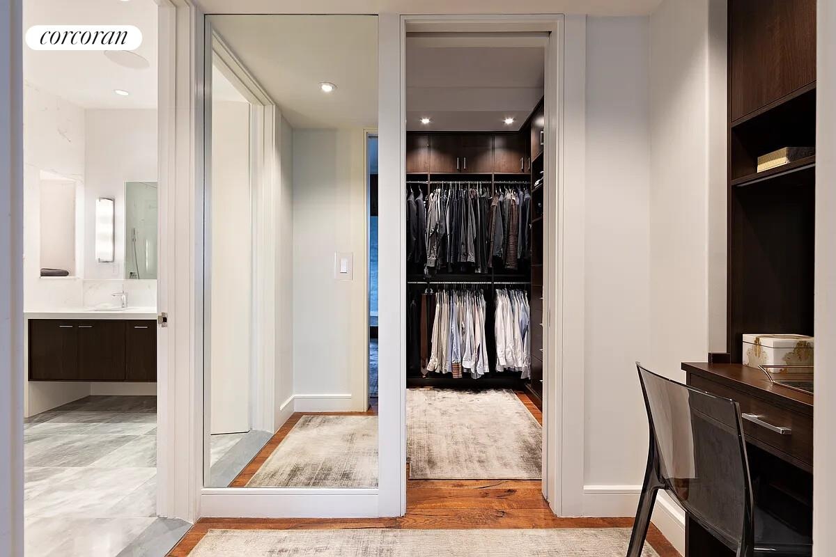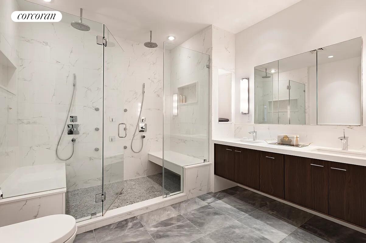 The thoughtful layout positions three generously sized bedrooms on the South-East side of the unit, each with direct access to a private terrace. The large primary bedroom suite boasts a dressing room, walk-in closet, and luxurious en-suite bathroom with custom fittings, Bardiglio marble, and a custom two-person shower.