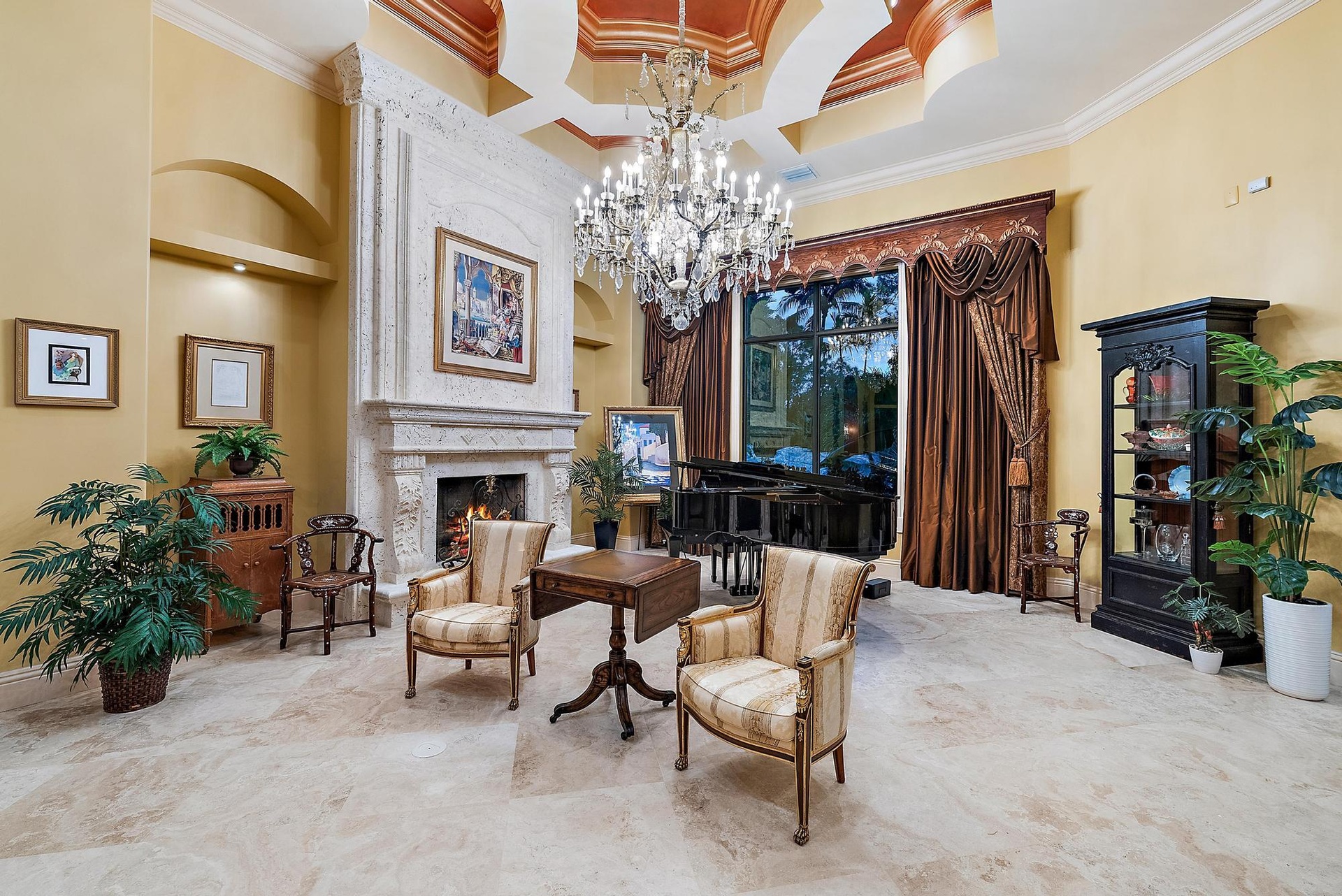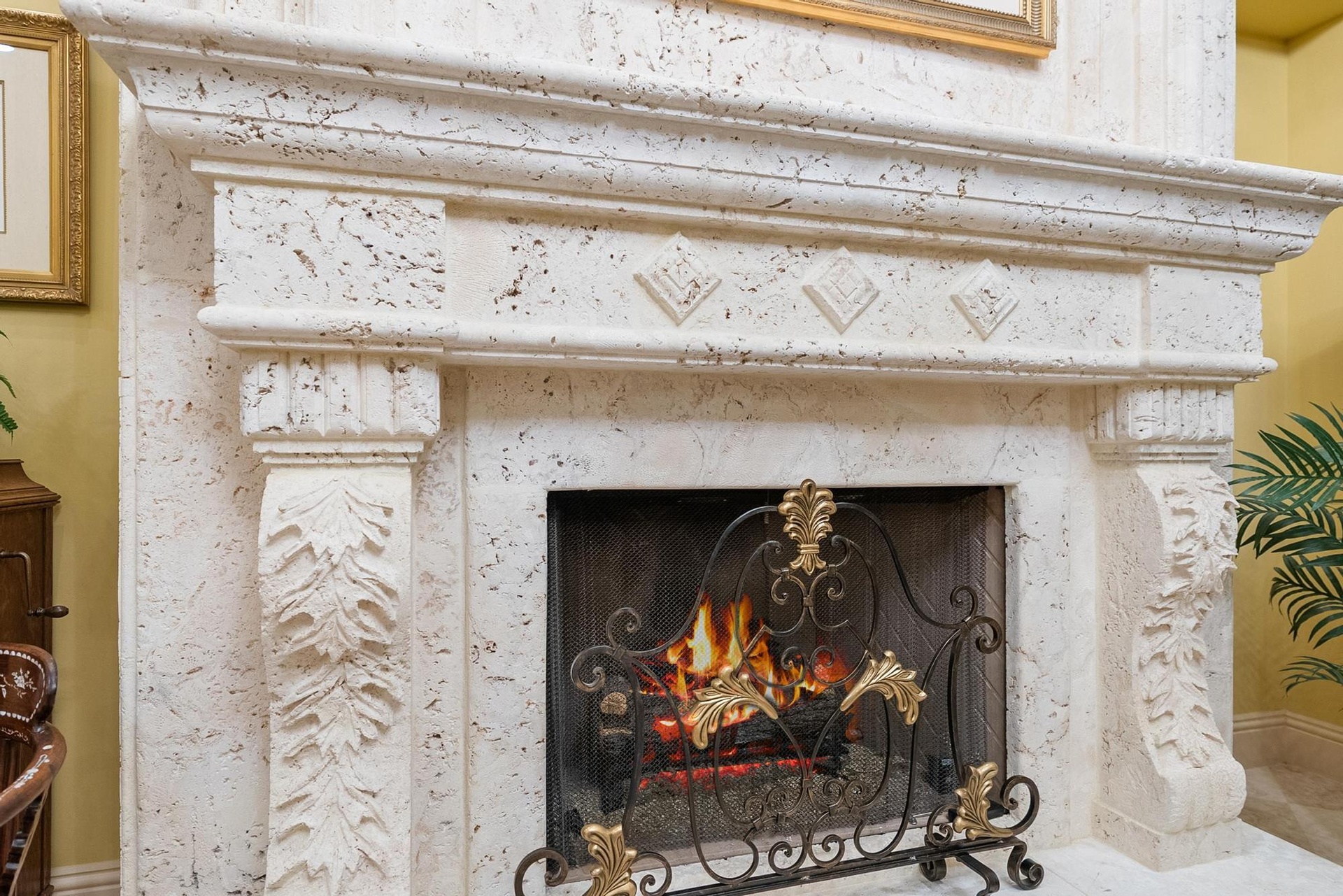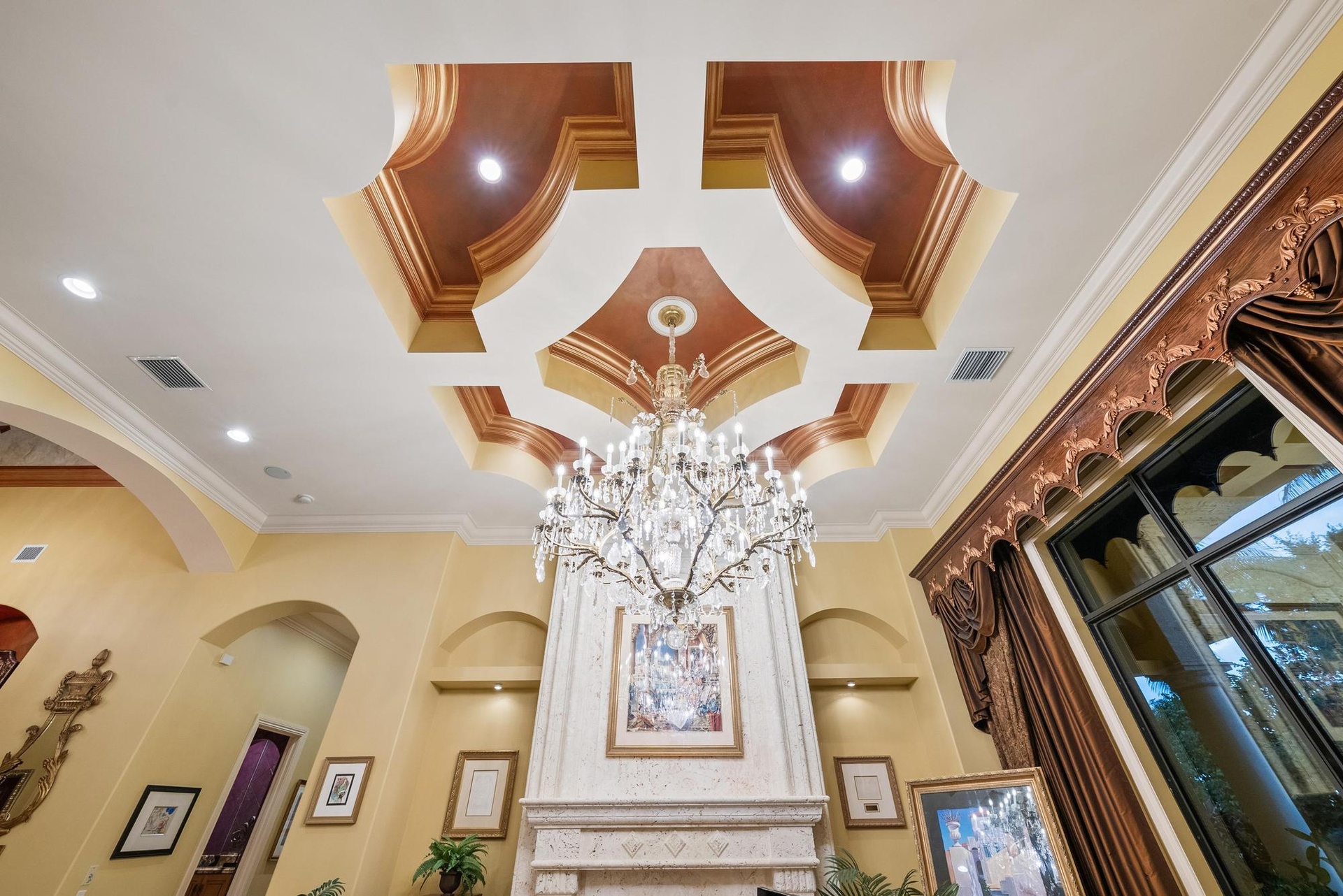 This extraordinary single-story estate in prestigious Bay Hill Estates offers the ultimate blend of timeless craftsmanship and modern convenience. Spanning over 5,400 square feet on a private one-acre lakefront lot, this residence is a showcase of artisan finishes, state-of-the-art upgrades, and resort-style amenities. From the moment you step into the grand foyer, graced with inlaid marble floors and soaring coffered ceilings, it is clear that every detail of this home has been designed with sophistication in mind. The living spaces are adorned with custom millwork, hand-selected marbles, solid wood cabinetry, and designer chandeliers, while a coral stone fireplace anchors the formal living room with warmth and elegance.