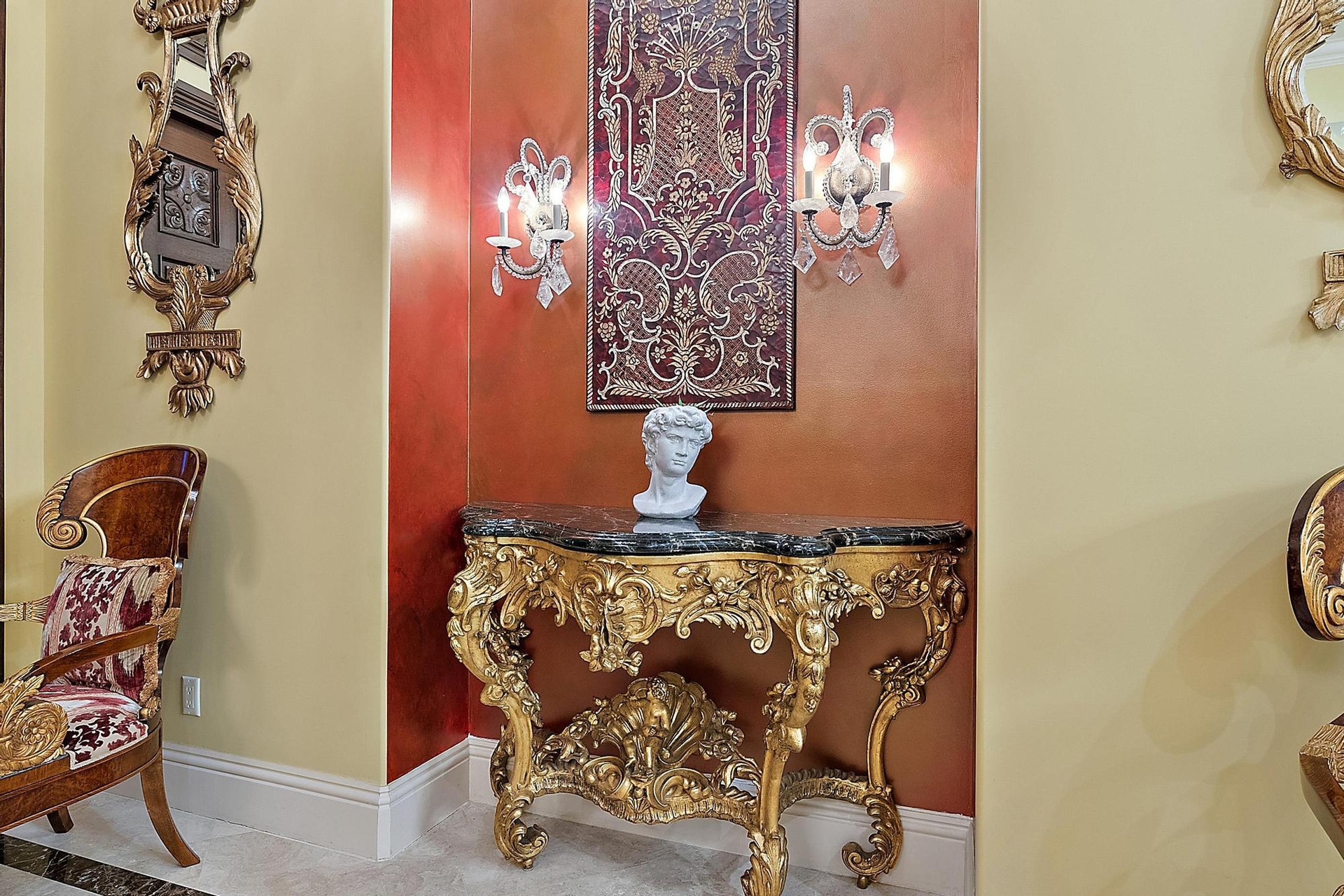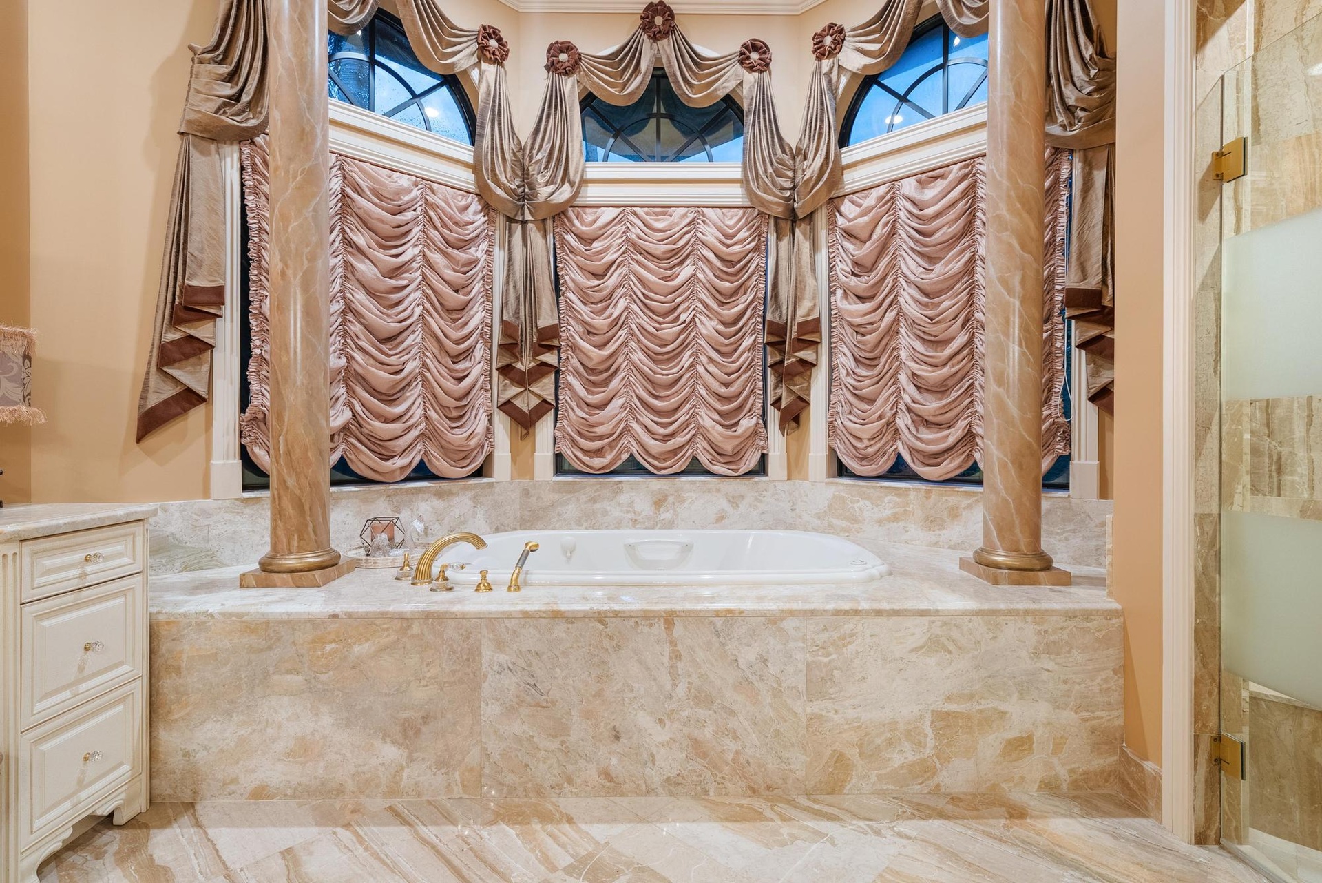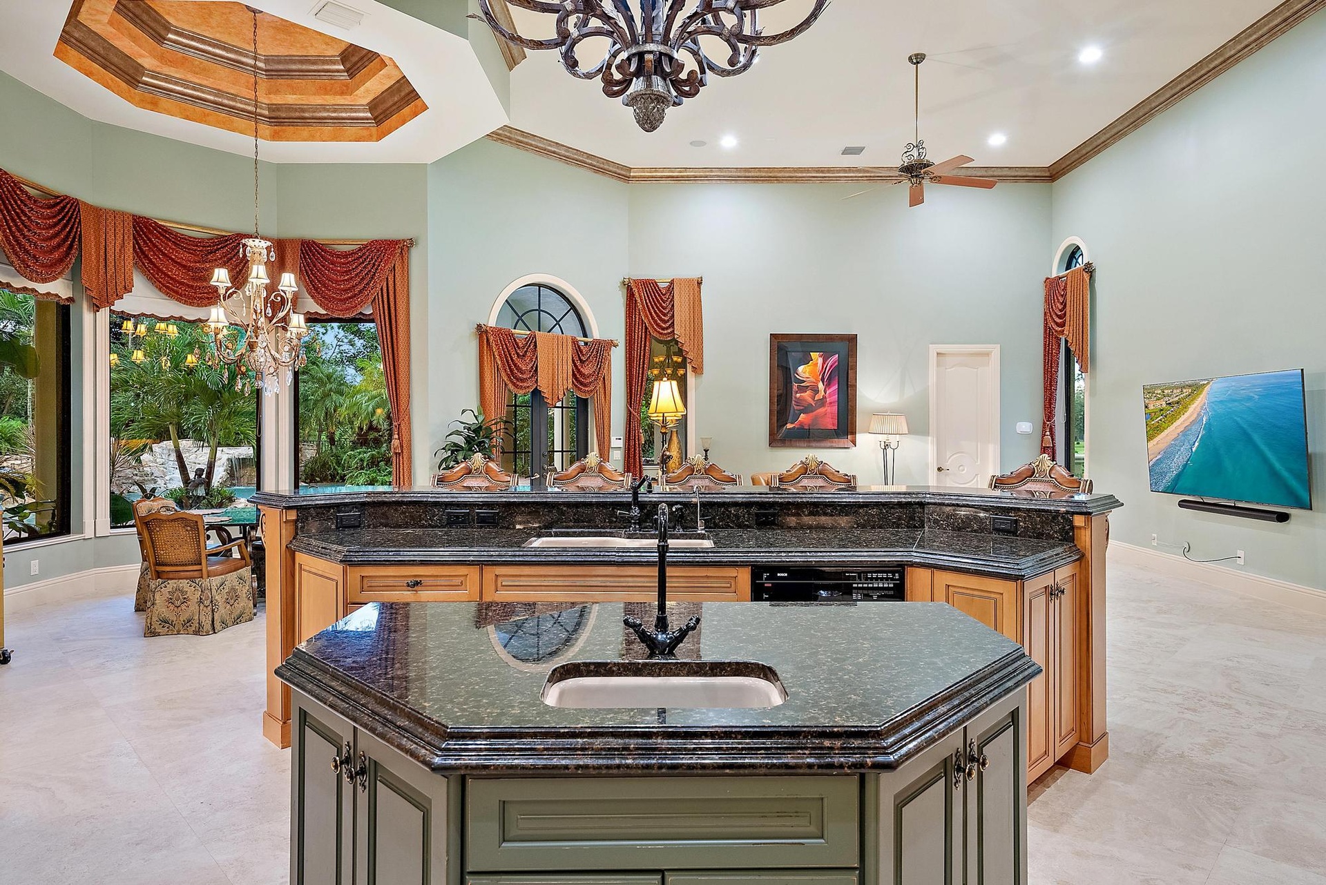 This extraordinary single-story estate in prestigious Bay Hill Estates offers the ultimate blend of timeless craftsmanship and modern convenience. Spanning over 5,400 square feet on a private one-acre lakefront lot, this residence is a showcase of artisan finishes, state-of-the-art upgrades, and resort-style amenities. From the moment you step into the grand foyer, graced with inlaid marble floors and soaring coffered ceilings, it is clear that every detail of this home has been designed with sophistication in mind. The living spaces are adorned with custom millwork, hand-selected marbles, solid wood cabinetry, and designer chandeliers, while a coral stone fireplace anchors the formal living room with warmth and elegance.