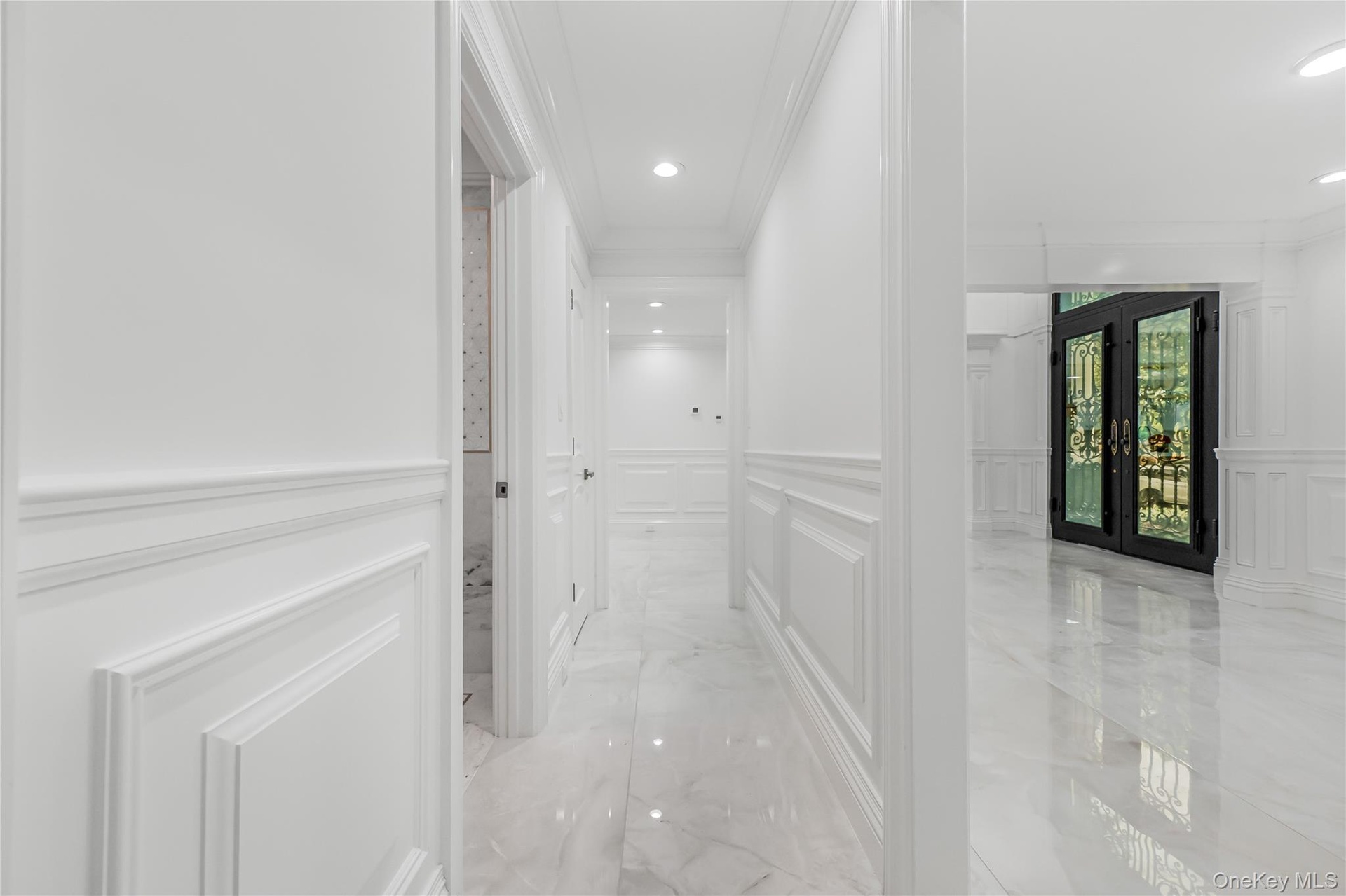 - Hall with light marble finish flooring, a decorative wall, french doors, a wainscoted wall, and crown molding