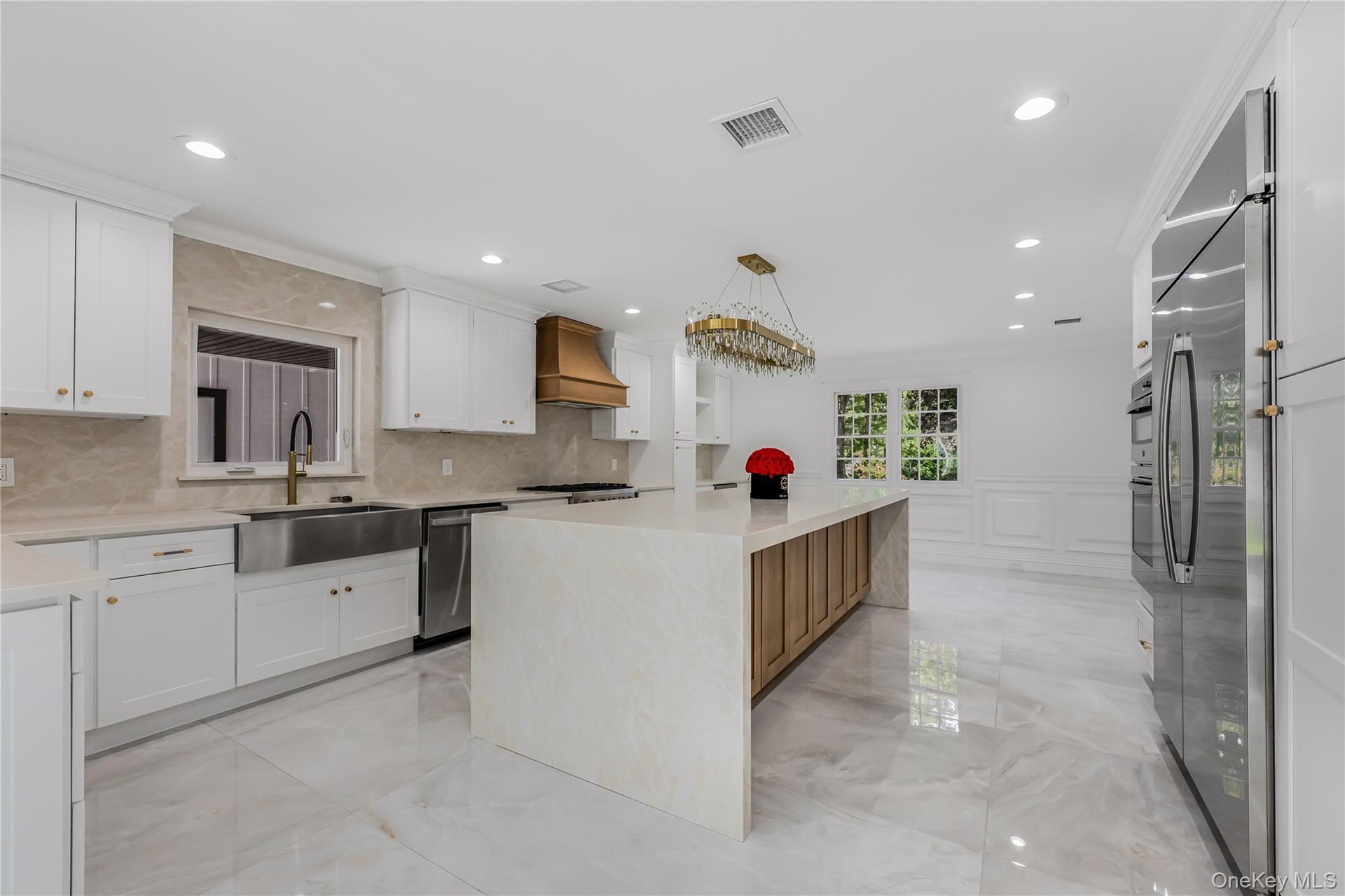 - Kitchen with light marble finish floors, light stone countertops, a kitchen island, hanging light fixtures, and recessed lighting