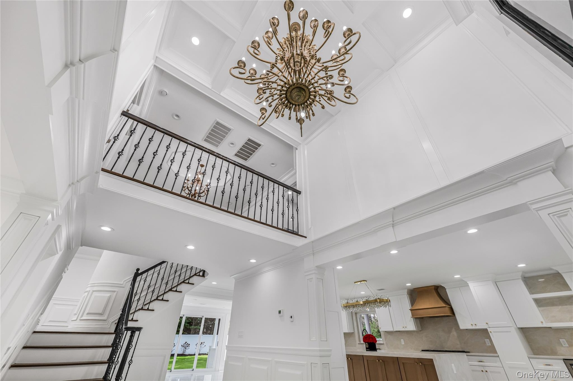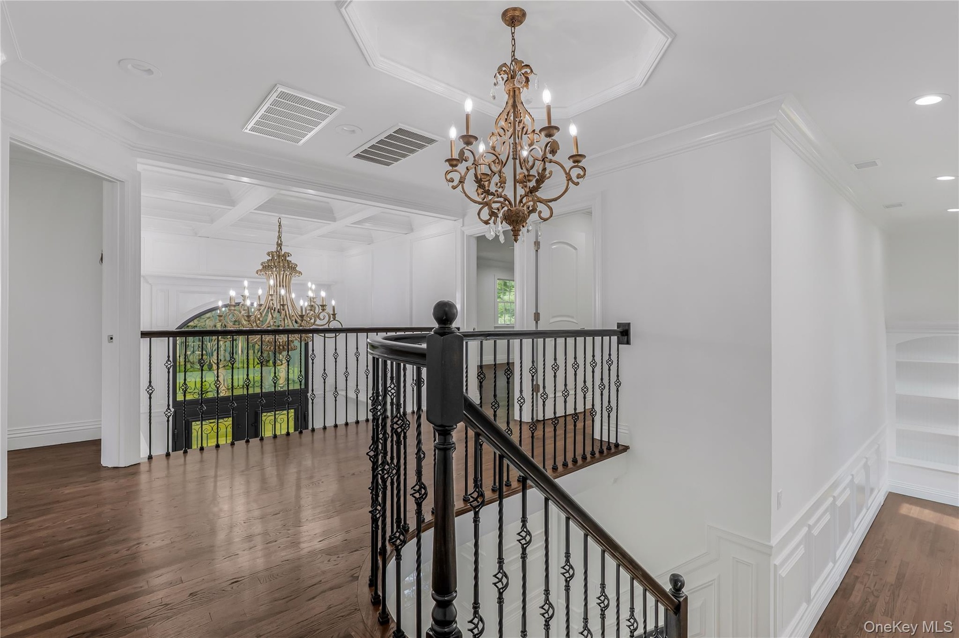 - Hall with a chandelier, coffered ceiling, an upstairs landing, dark wood-style flooring, and a decorative wall