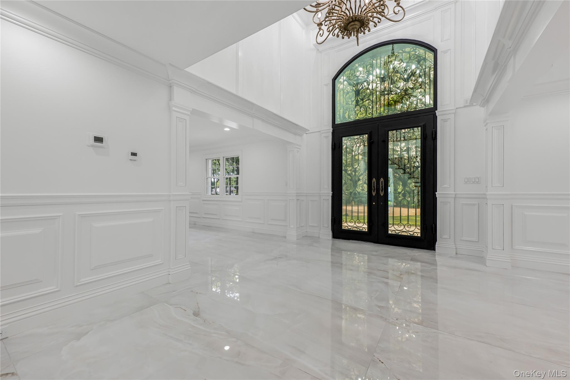- Foyer with a decorative wall, marble tiled floors, french doors, a chandelier, and a wainscoted wall