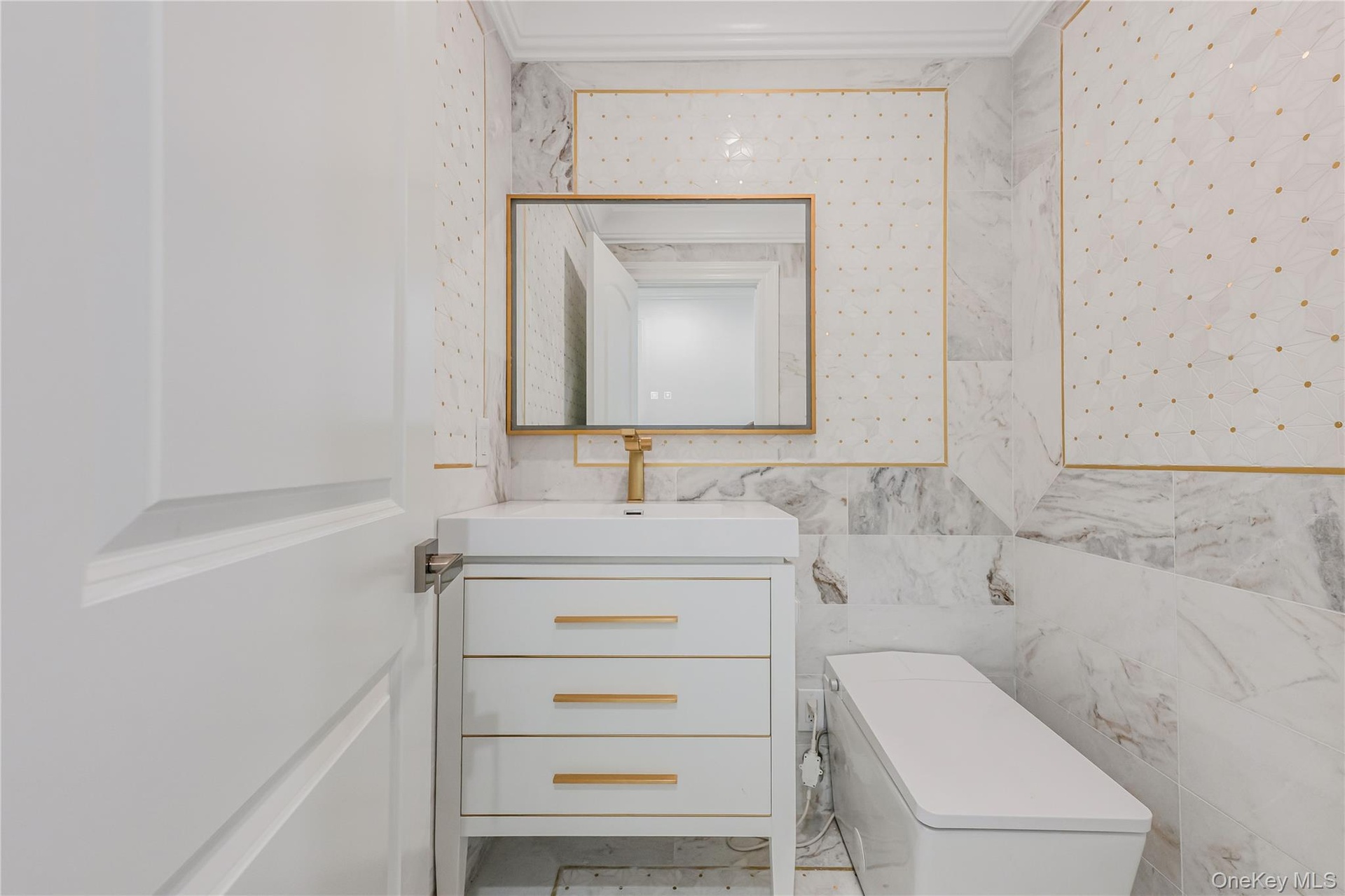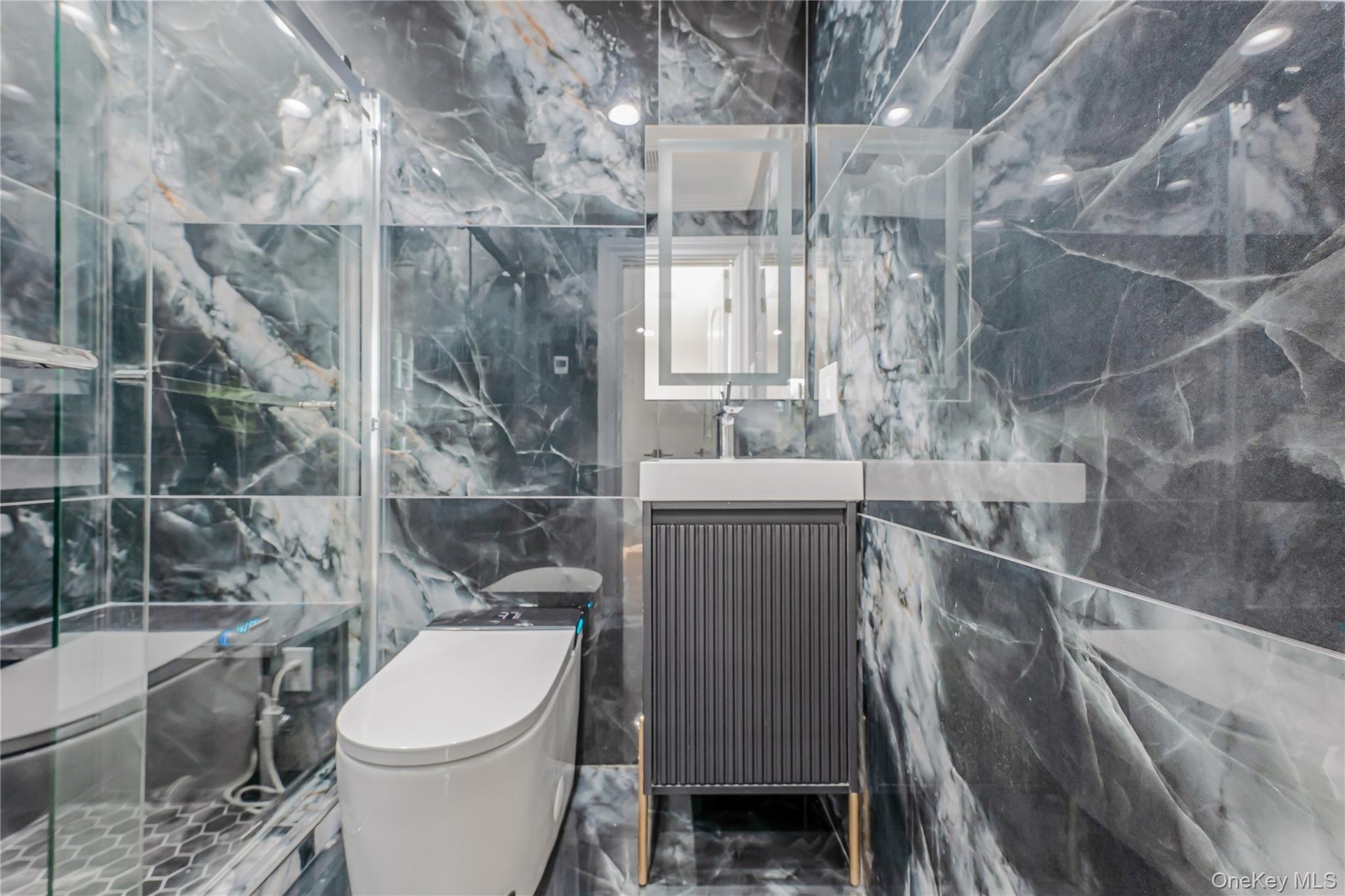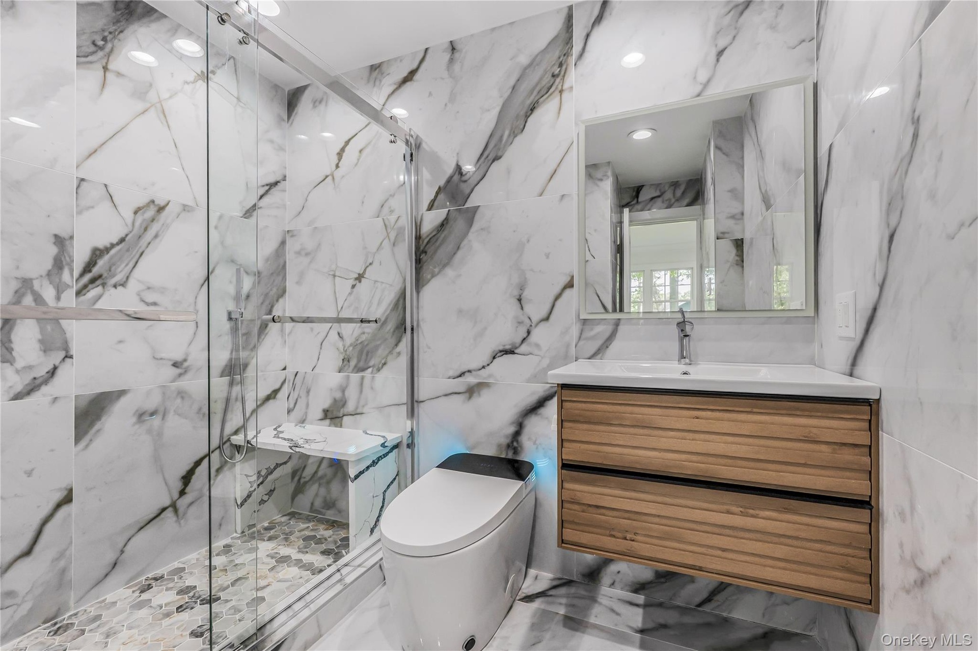 - Bathroom with marble tiled flooring, vanity, a marble finish shower, tile walls, and stone wall