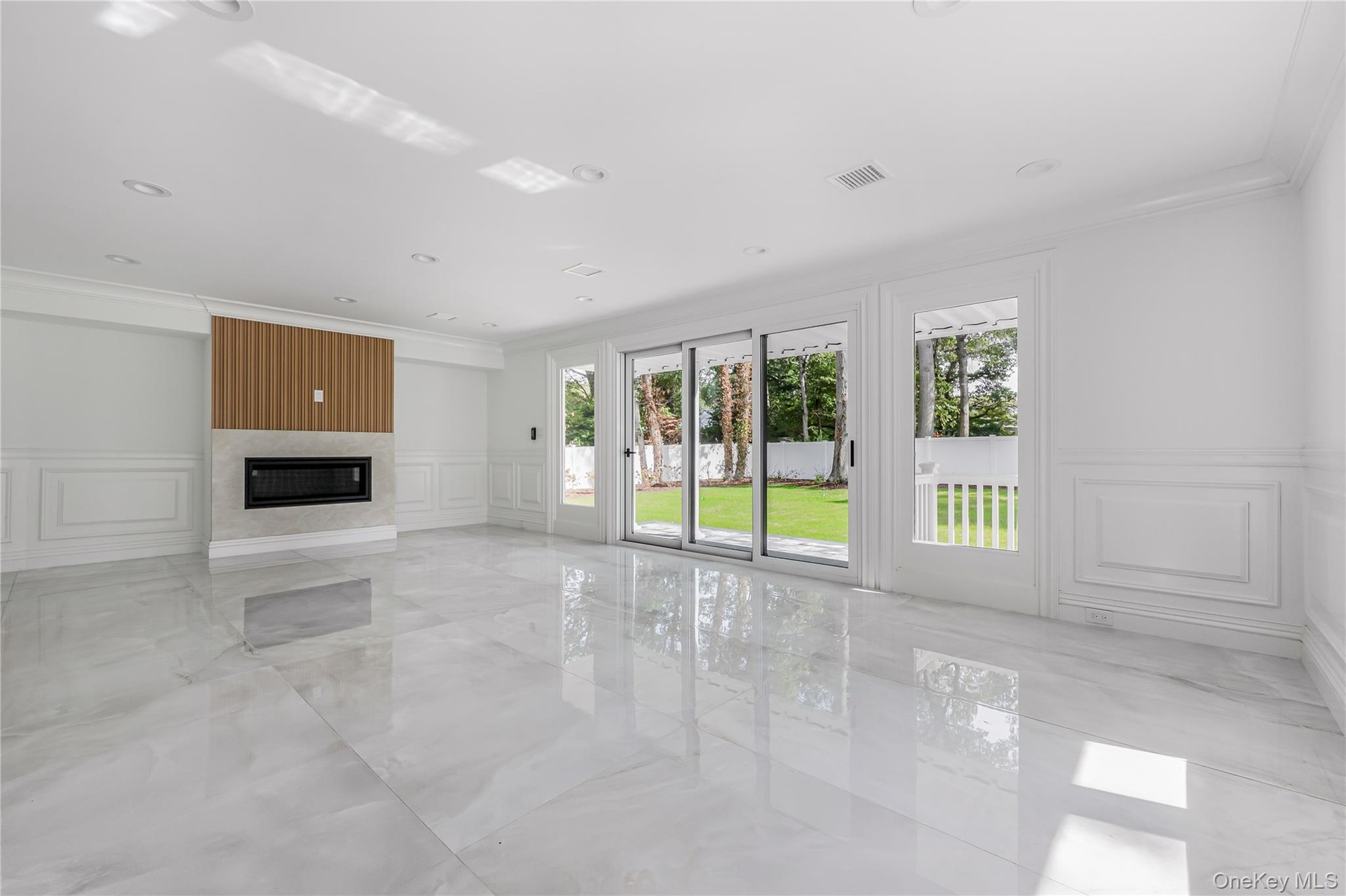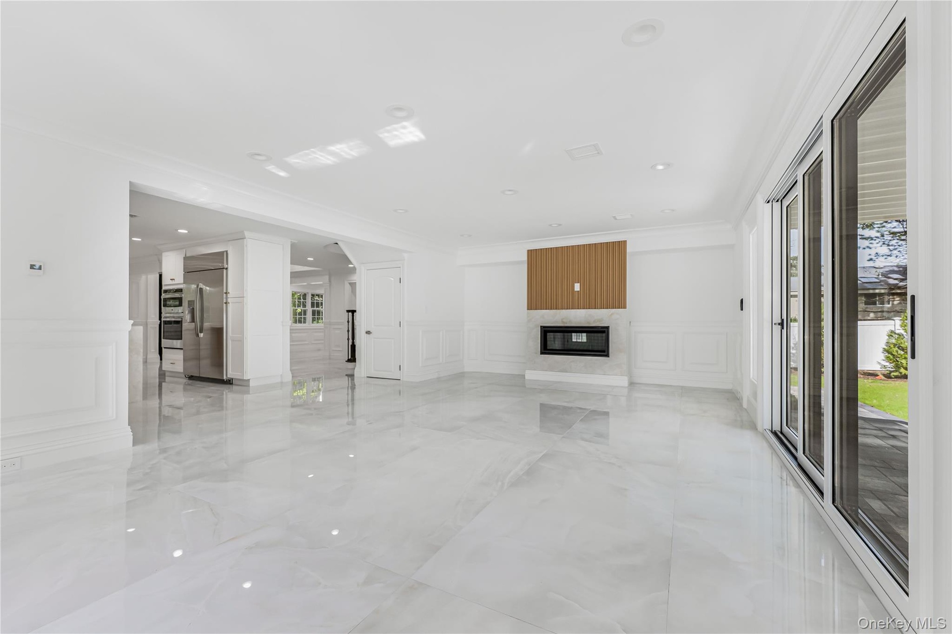 - Unfurnished living room with a decorative wall, wainscoting, ornamental molding, a fireplace, and light marble finish flooring