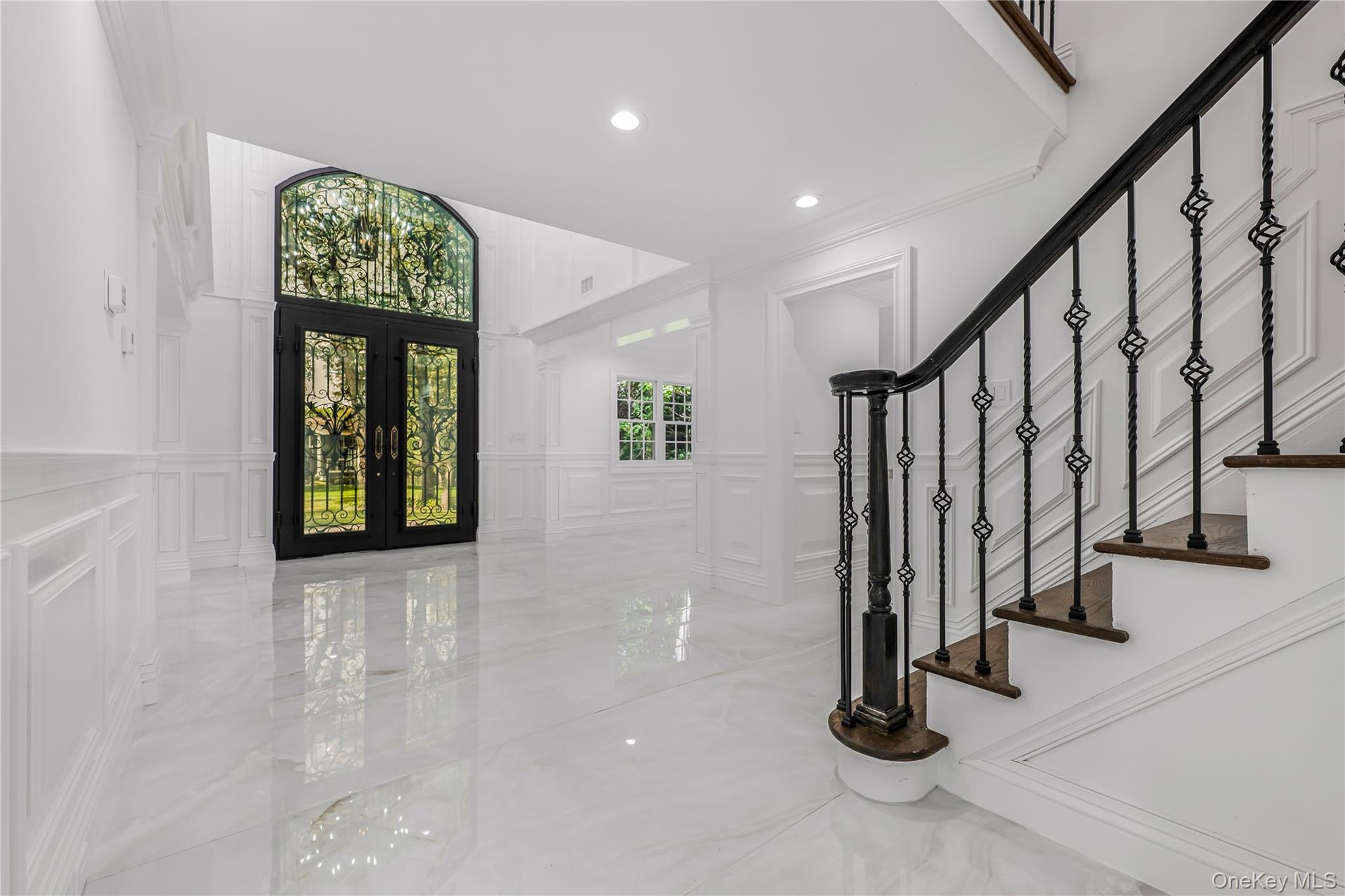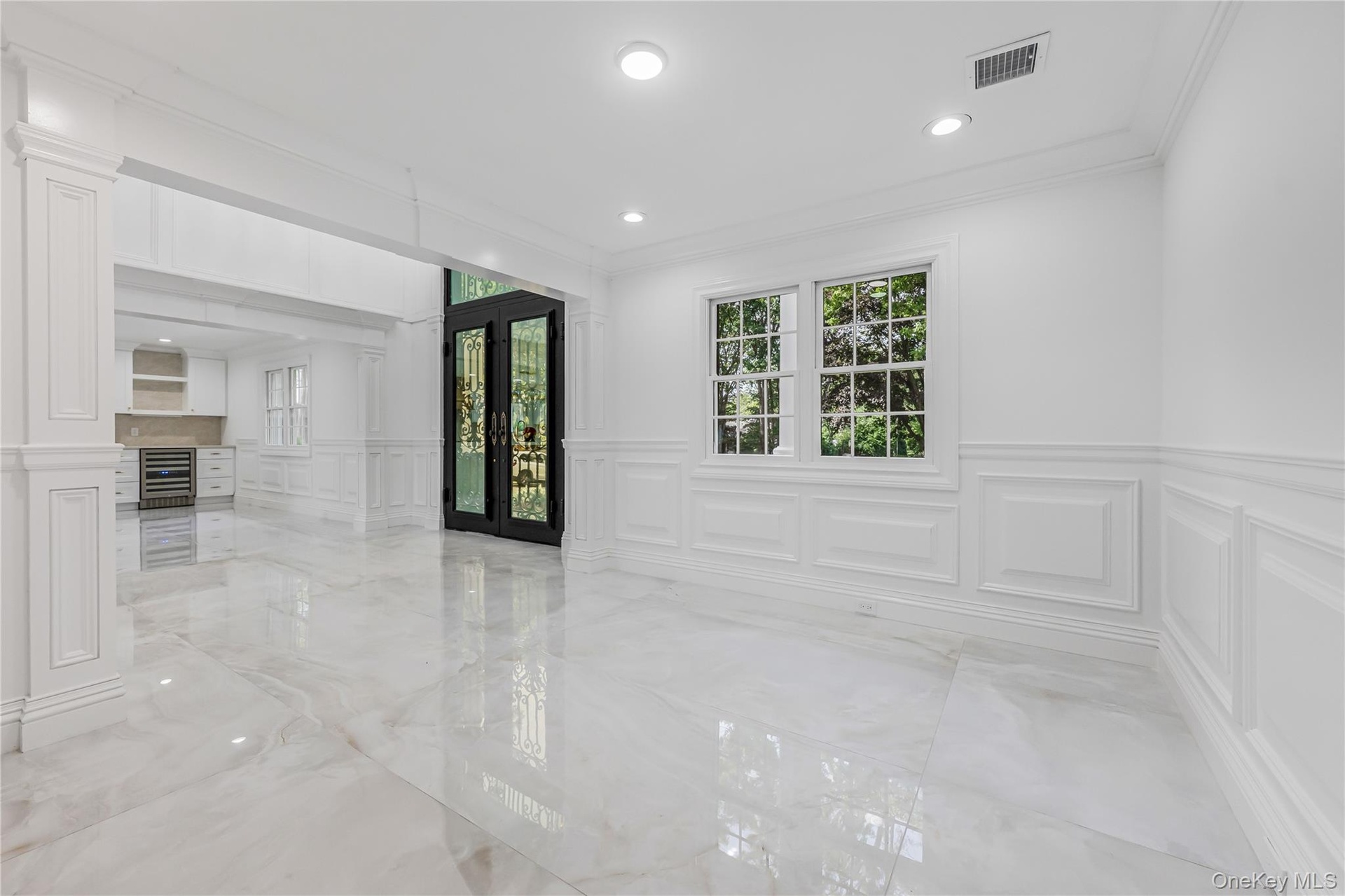 - Foyer entrance with a decorative wall, french doors, marble tiled floors, recessed lighting, and a wainscoted wall