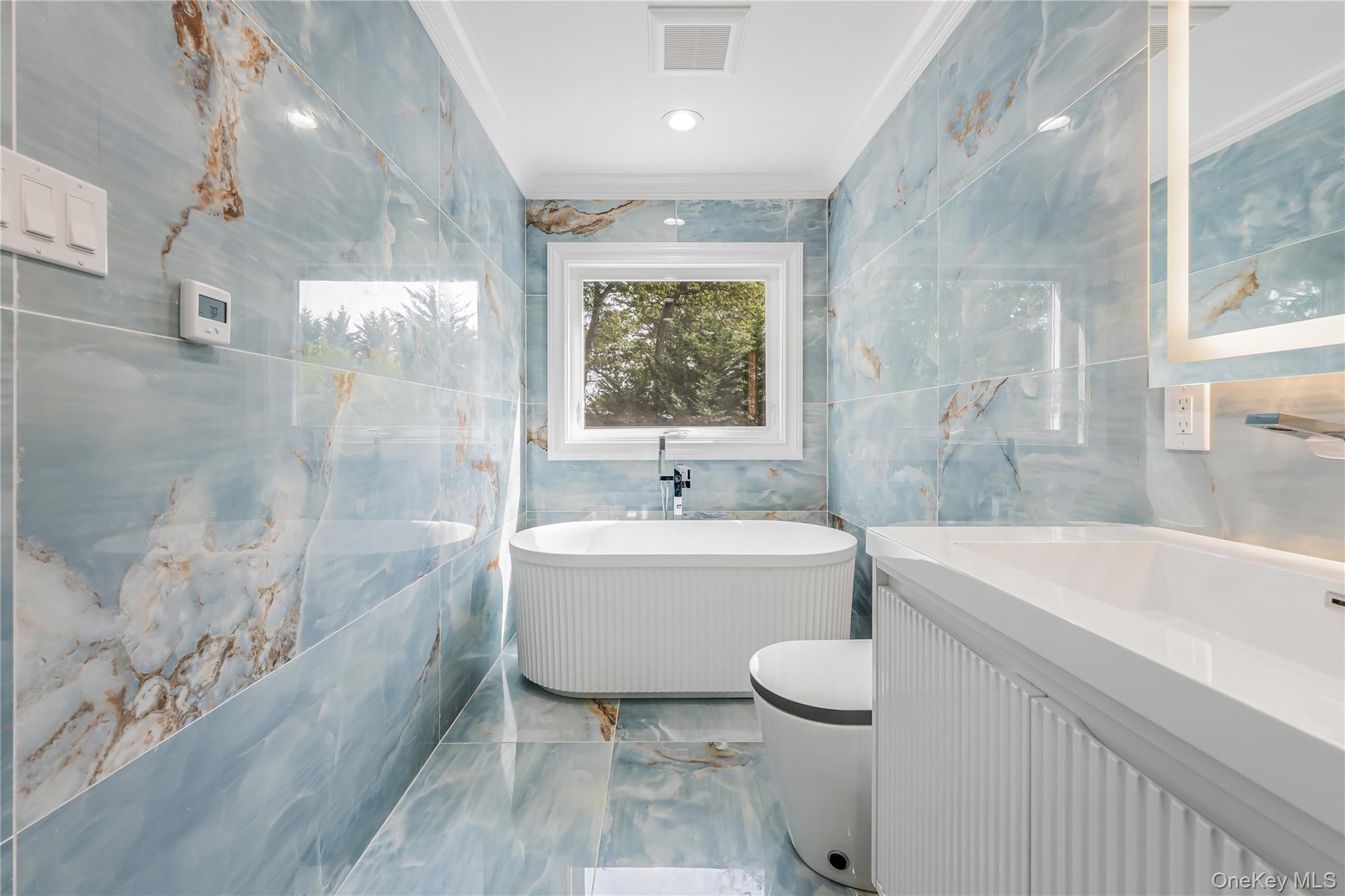 - Full bathroom featuring tile walls, ornamental molding, a soaking tub, vanity, and recessed lighting