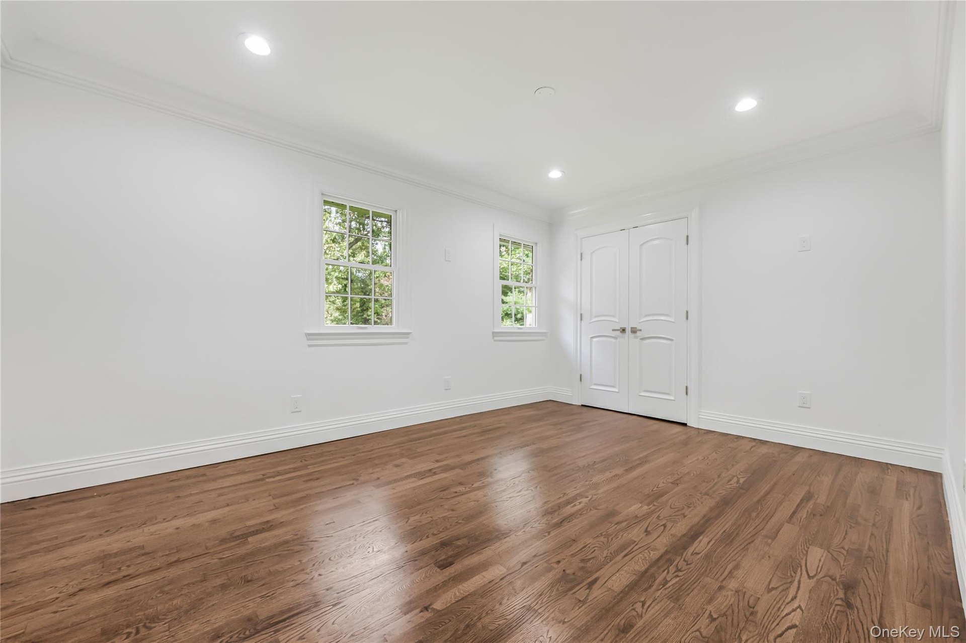 - Unfurnished bedroom with ornamental molding, wood finished floors, recessed lighting, and a closet