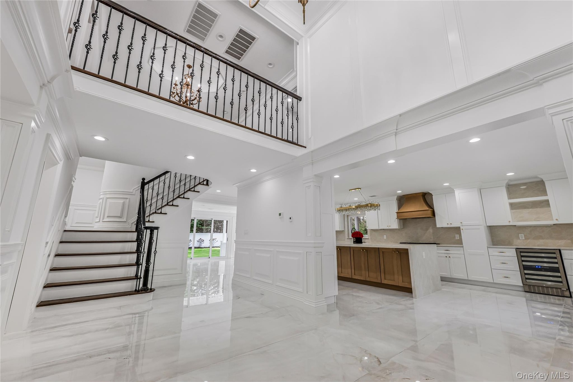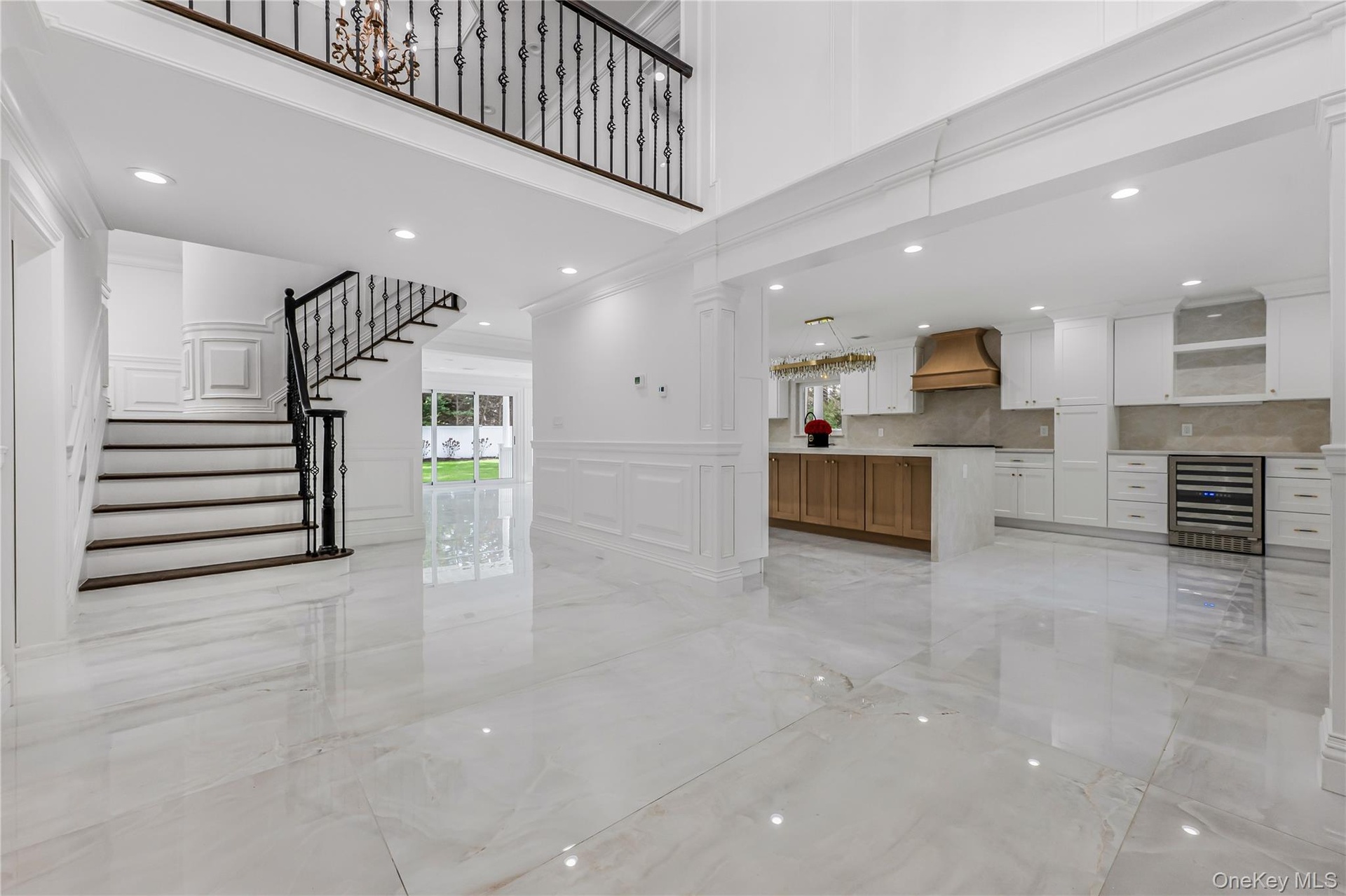 - Unfurnished living room with a high ceiling, a decorative wall, light marble finish flooring, stairs, and beverage cooler
