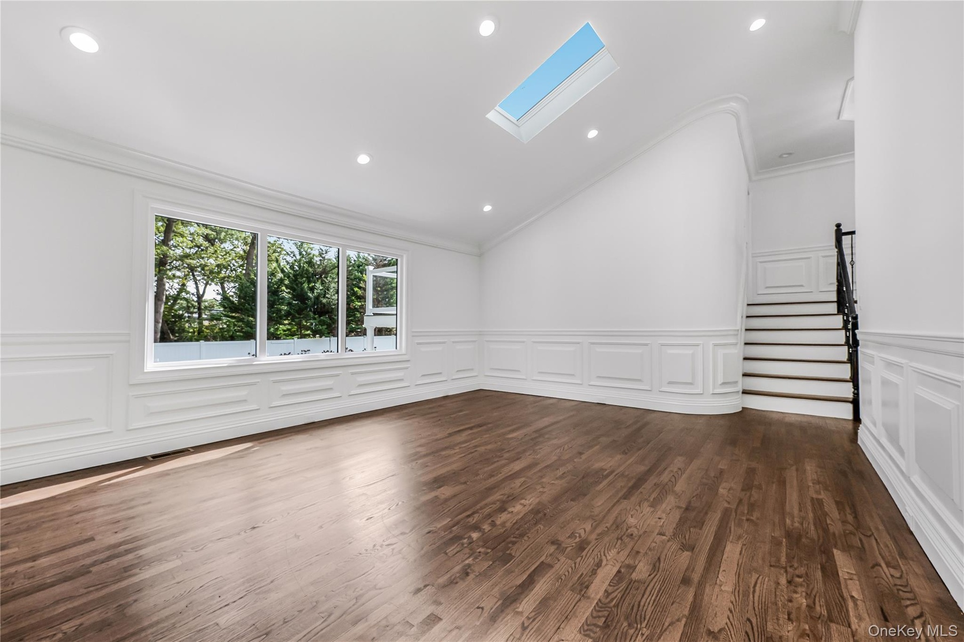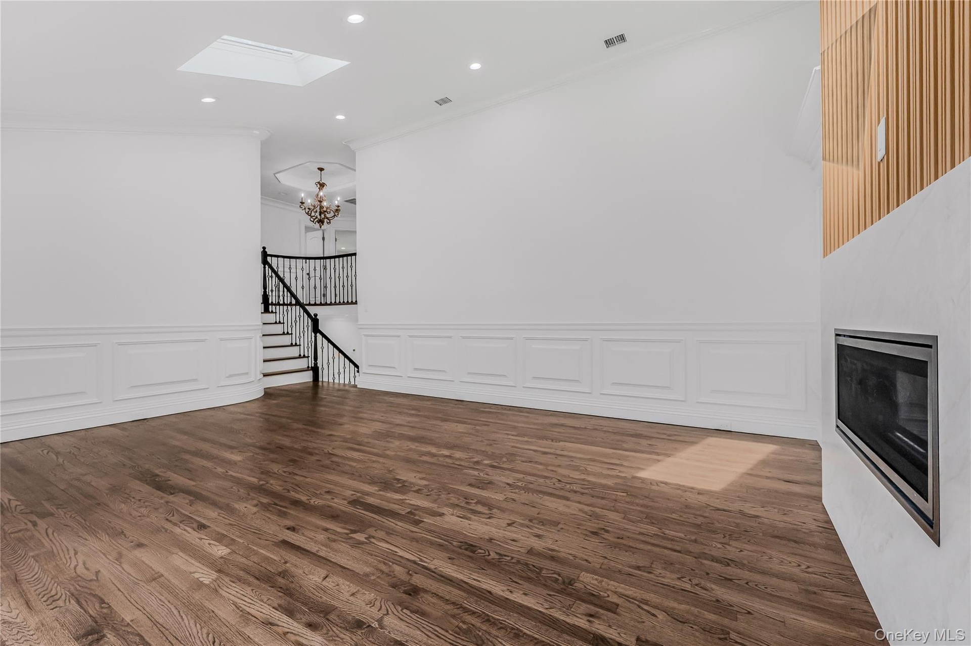 - Unfurnished living room with crown molding, a skylight, dark wood-type flooring, a decorative wall, and a chandelier